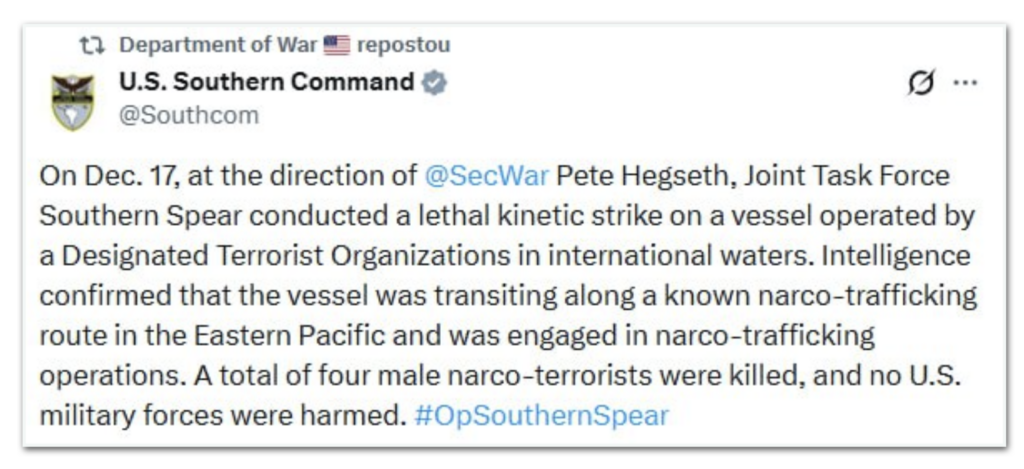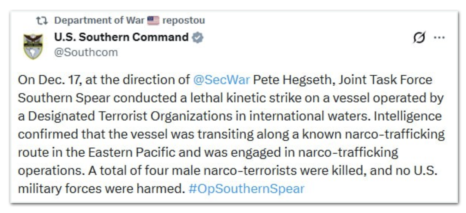 On Dec. 17, at the direction of @SecWar Pete Hegseth, Joint Task Force Southern Spear conducted a lethal kinetic strike on a vessel operated by a Designated Terrorist Organizations in international waters. Intelligence confirmed that the vessel was transiting along a known… pic.twitter.com/Yhu3LSOyea