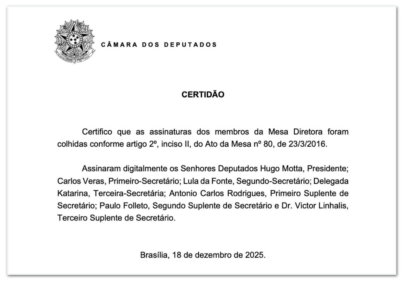 A decisão de cassação foi publicada exclusivamente pela Mesa Diretora da Câmara, sem a tradicional passagem pelo plenário da Casa. Outros 6 integrantes assinaram o documento.