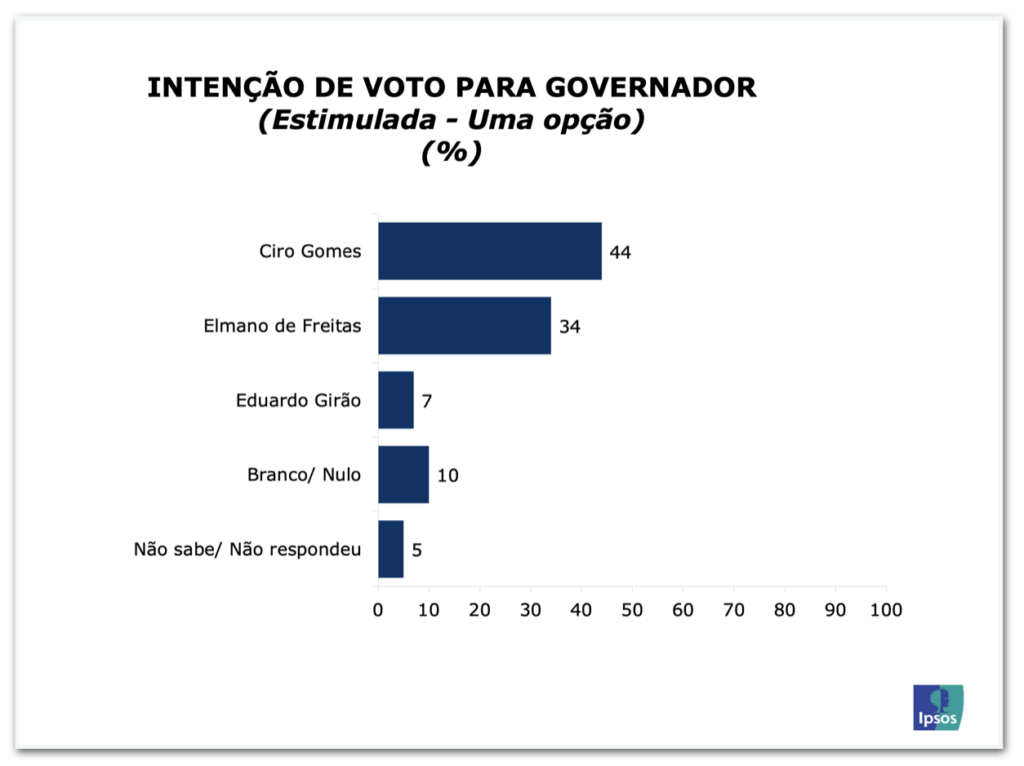 A pesquisa testou também um eventual cenário de 2º turno entre Ciro e Elmano. O ex-governador também tem vantagem: 49% das intenções contra 39% do atual chefe do Estado.