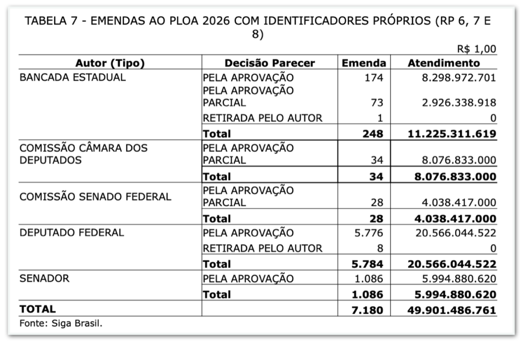 O texto aprovado preserva os recursos para emendas parlamentares, parte delas com execução obrigatória, e estabelece que 65% das emendas impositivas deverão ser pagas até o 1º semestre de 2026, conforme regra definida na LDO (Lei de Diretrizes Orçamentárias), aprovada pelo Congresso no início do mês. A medida foi incluída pelos congressistas para assegurar a liberação de recursos em ano eleitoral.