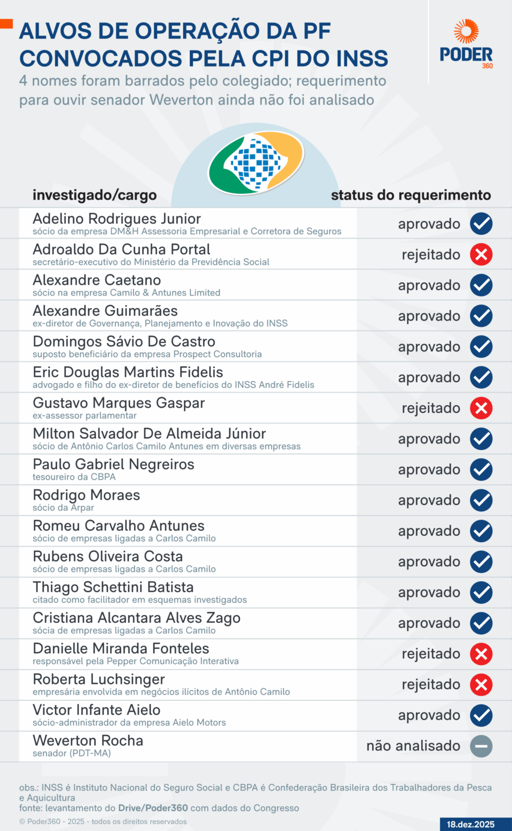 Desse total, 50 pedidos foram rejeitados. Vários deles estão ligados a 4 alvos da nova fase da operação Sem Desconto, que a PF (Polícia Federal) deflagrou na 5ª feira (18.dez.2025).