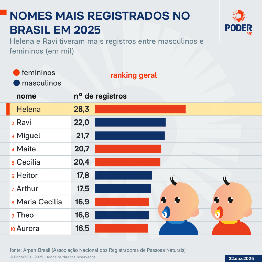Helena foi o nome preferido dos brasileiros no momento de registrar seus filhos pelo 2º ano consecutivo, com 28.271 registros. Ravi vem em seguida, com 21.982, e lidera a escolha para meninos, segundo dados divulgados nesta 2ª feira (22.dez.2025) pela Arpen-Brasil (Associação Nacional dos Registradores de Pessoas Naturais).