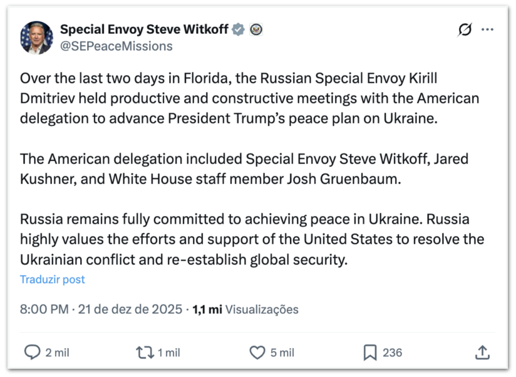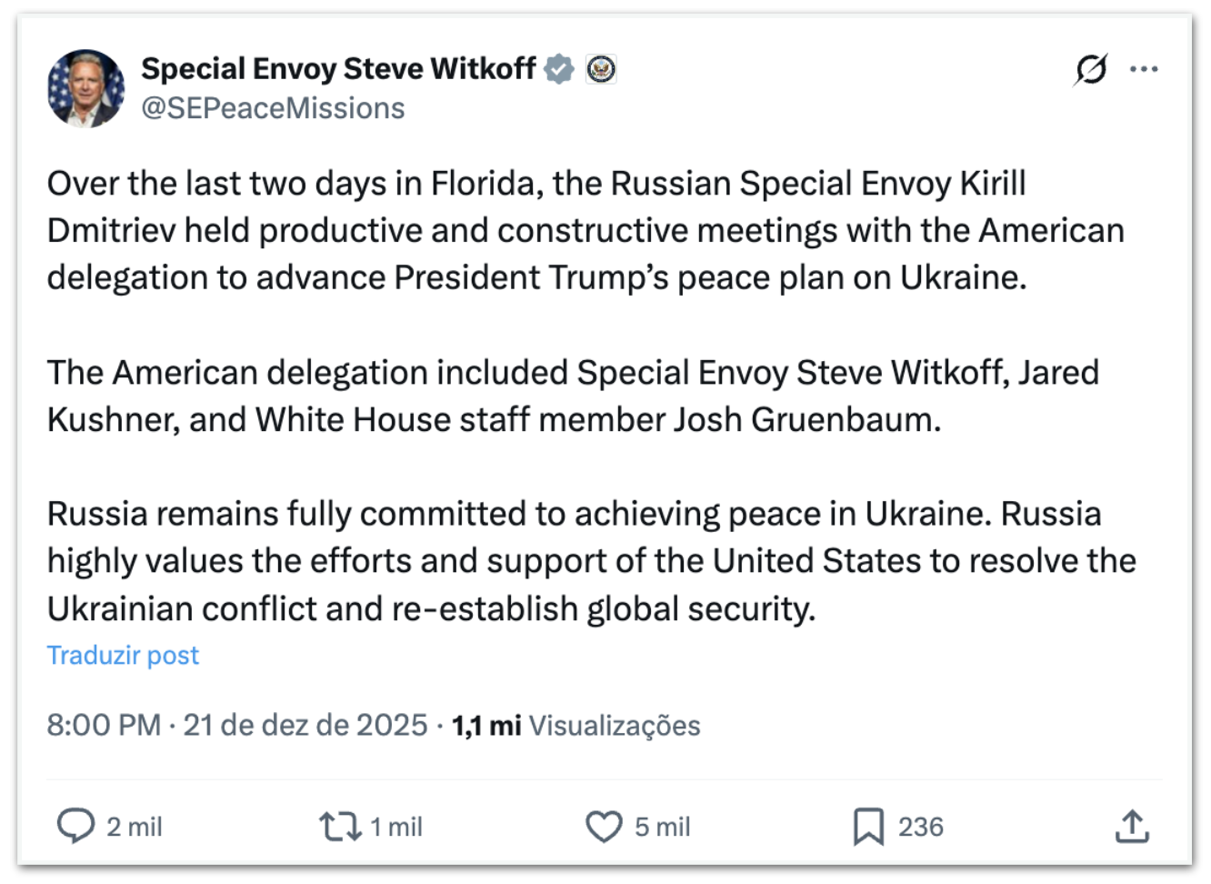 Em publicação no X, feita no domingo (21.dez.2025), Witkoff declarou: “A Rússia valoriza muito os esforços e o apoio dos Estados Unidos para resolver o conflito ucraniano e restabelecer a segurança global”.