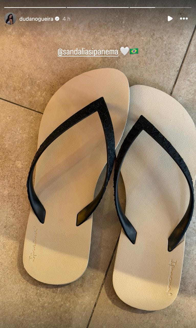 A filha do senador Ciro Nogueira (PP-PI), a influenciadora Duda Nogueira, postou nesta 3ª feira (23.dez.2025) em seu perfil no Instagram uma foto de um par de chinelos da marca Ipanema. Na imagem, a influenciadora marcou a empresa e comentou com um coração seguido da bandeira do Brasil.
