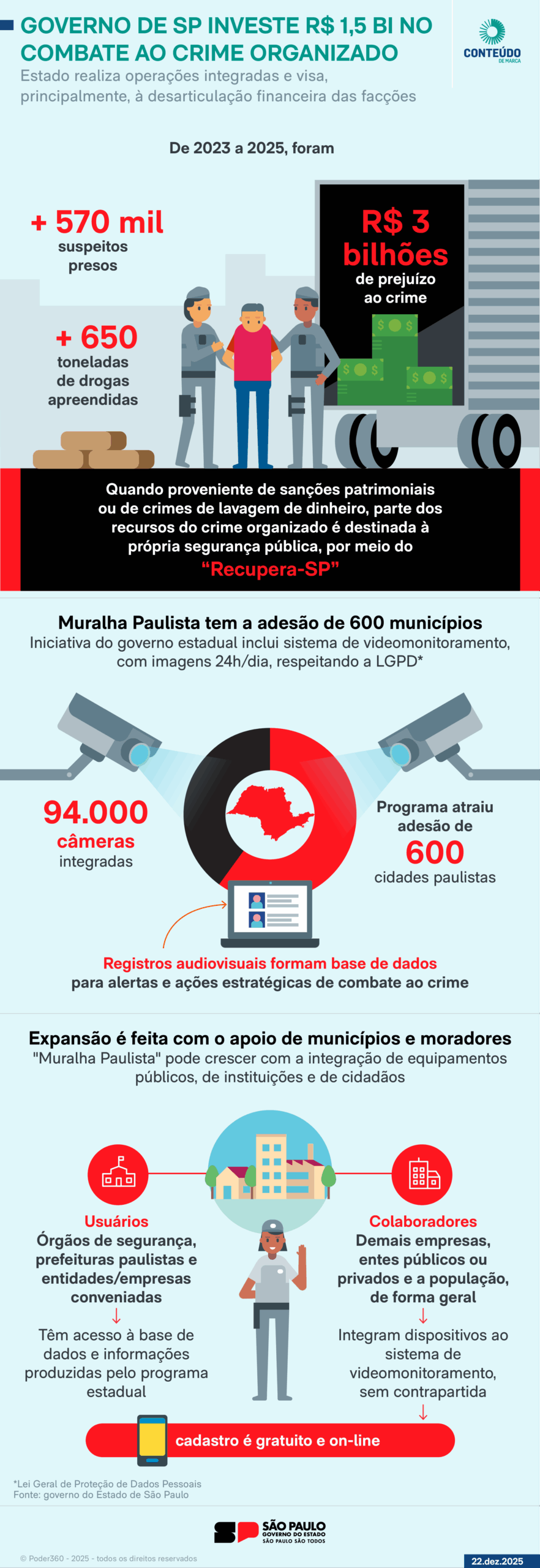 Desde o início de 2023, o governo de São Paulo investiu cerca de R$ 1,5 bilhão em ações de enfrentamento ao crime organizado. Nesse contexto, a tecnologia e a integração de dados encabeçam as estratégias de trabalho das forças de segurança paulistas para identificar padrões, mapear áreas de risco e agir de maneira assertiva para desarticular e coibir esquemas que custeiam as facções.
