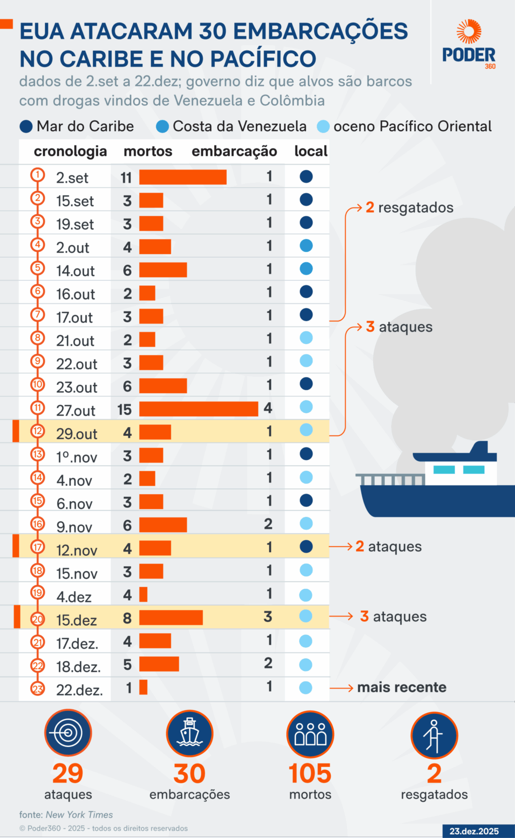 Até o momento, 30 embarcações foram atacadas pelos militares norte-americanos e 105 pessoas morreram nas ofensivas.