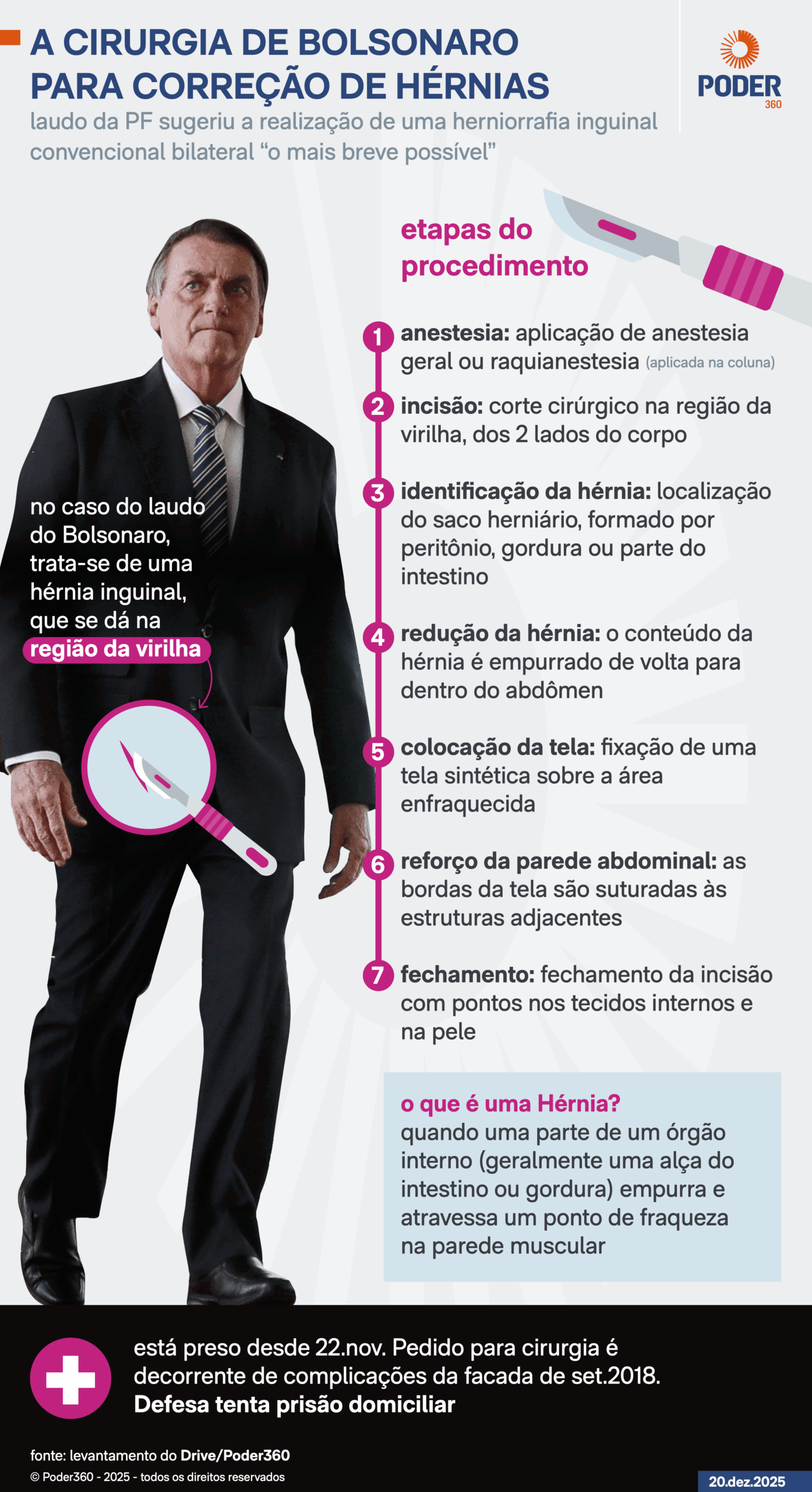 O ex-presidente tem duas hérnias, uma do lado direito e outra do lado esquerdo. Uma hérnia inguinal ocorre quando uma alça do intestino ou tecido abdominal se projeta através de um ponto fraco ou abertura que se forma na parede muscular do abdômen, perto da região da virilha. Ou seja, é um pequeno “buraco” que se abre. Essa passagem é operada e reparada em geral com a colocação de uma tela de polipropileno, um material sintético biocompatível que reforça a parede abdominal e fica integrado aos tecidos do corpo.