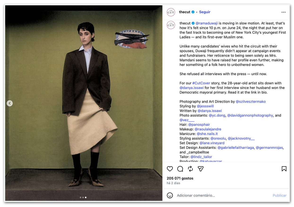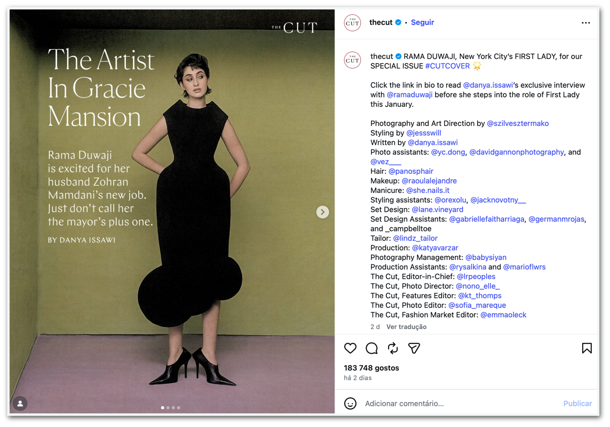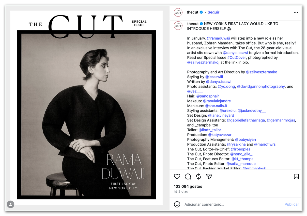 Rama Duwaji, futura primeira-dama de Nova York, é capa de uma edição especial da revista The Cut, lançada neste mês. Ilustradora e ativista norte-americana com ascendência síria, ela declarou que “definitivamente” não vai parar de trabalhar depois que seu marido, Zohran Mamdani (Partido Democrata) tomar posse como prefeito em janeiro de 2026