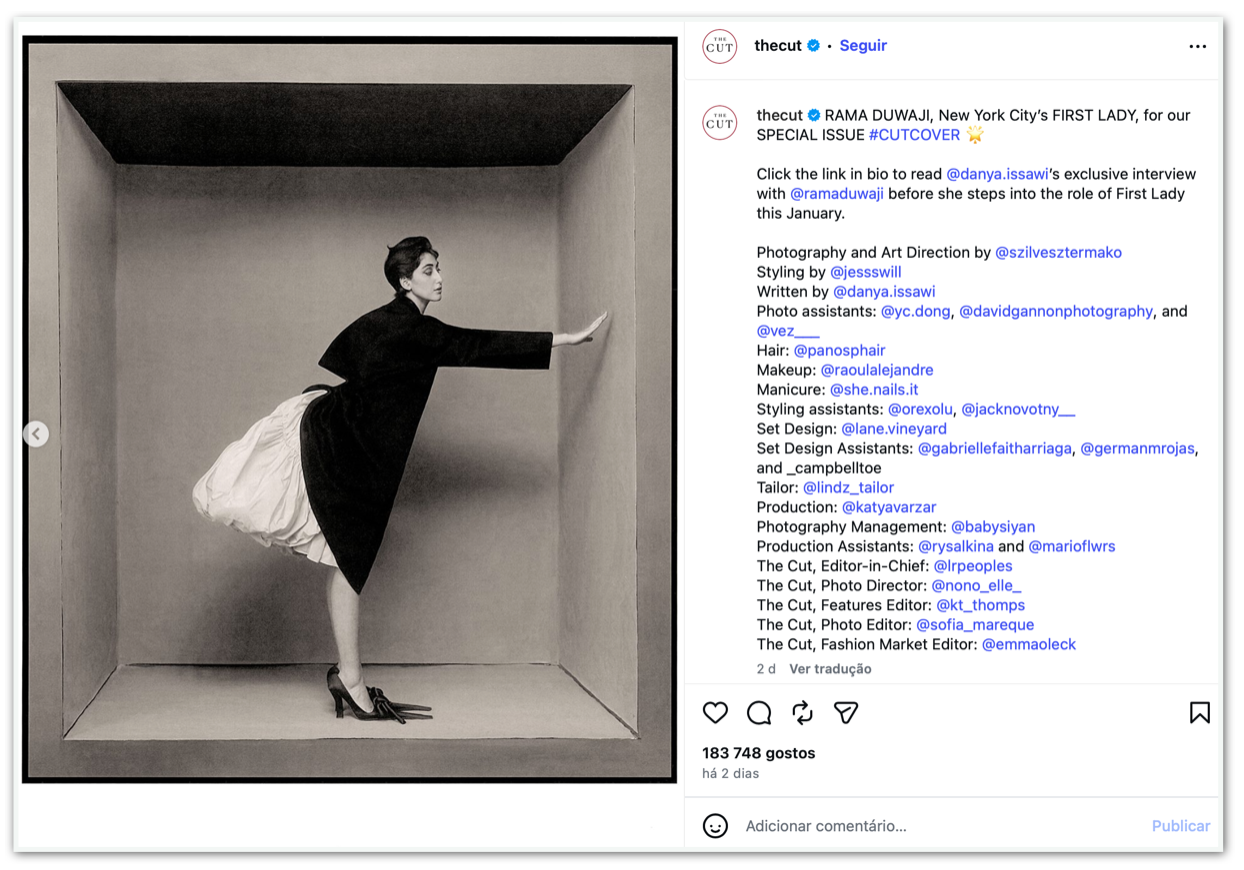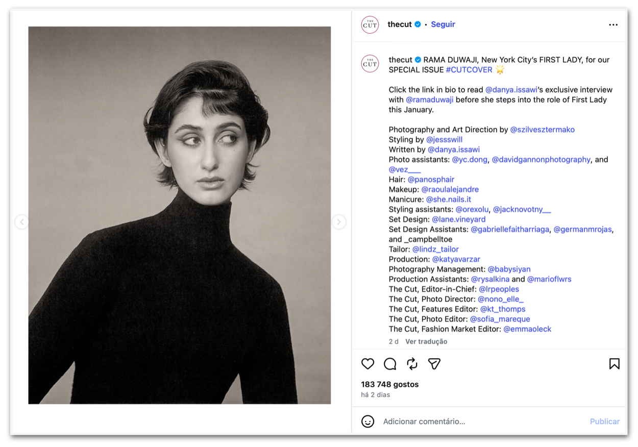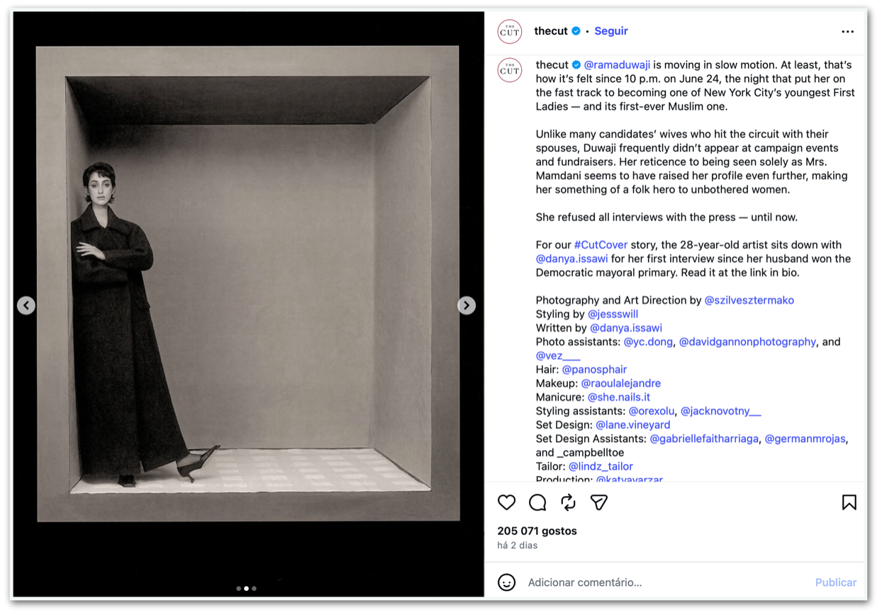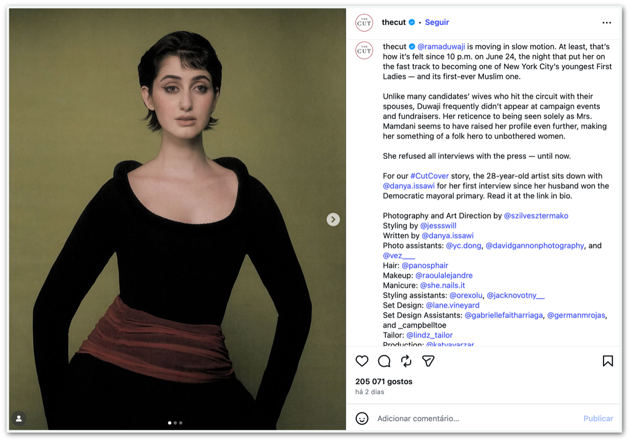 Rama Duwaji, futura primeira-dama de Nova York, é capa de uma edição especial da revista The Cut, lançada neste mês. Ilustradora e ativista norte-americana com ascendência síria, ela declarou que “definitivamente” não vai parar de trabalhar depois que seu marido, Zohran Mamdani (Partido Democrata) tomar posse como prefeito em janeiro de 2026