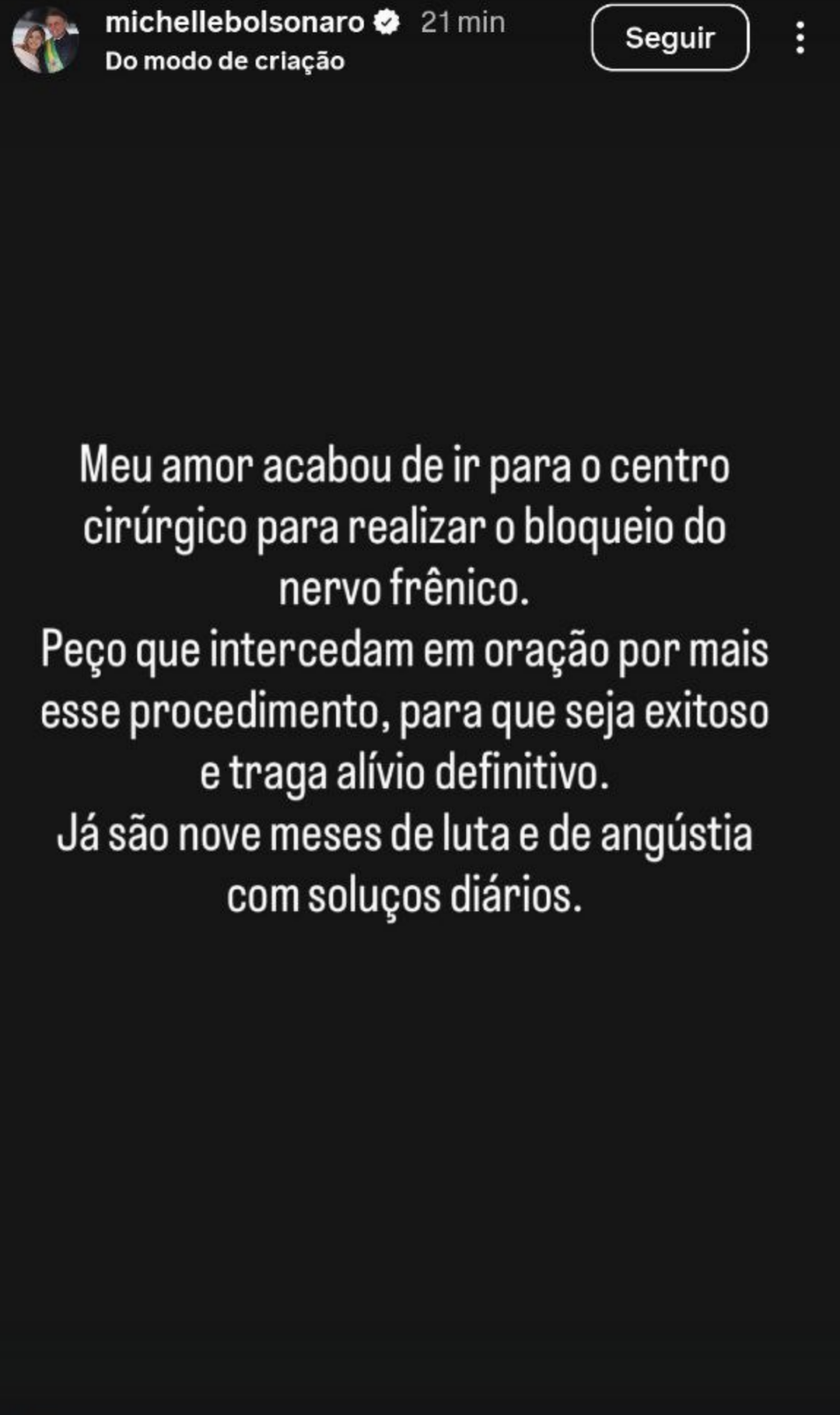 “Meu amor acabou de ir para o centro cirúrgico para realizar o bloqueio do nervo frênico. Peço que intercedam em oração por mais esse procedimento, para que seja exitoso e traga alívio definitivo. Já são 9 meses de luta e de angústia com soluços diários”, escreveu Michelle em seu perfil no Instagram.