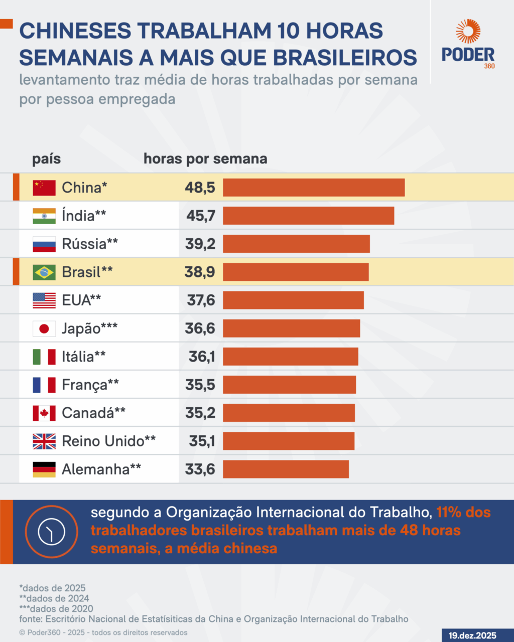 Segundo a Organização Internacional do Trabalho, um trabalhador brasileiro trabalha 38,9 horas semanais, cerca de 10 horas a menos do que o chinês. A estimativa é que 11% dos trabalhadores brasileiros trabalham mais do que 48 horas semanais, no que a organização classifica como “horas longas de trabalho”.
