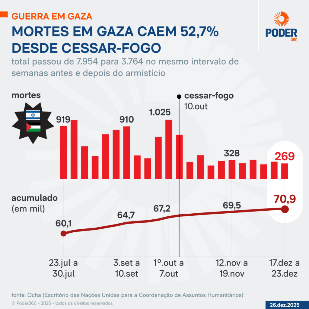 O levantamento do Poder360 foi feito com base em relatórios semanais da Ocha, considerando 11 semanas anteriores e 11 semanas posteriores ao cessar-fogo firmado em 10 de outubro. Os documentos apresentam números cumulativos de mortes, classificados por grupos populacionais, mas sem detalhamento das causas específicas das mortes.