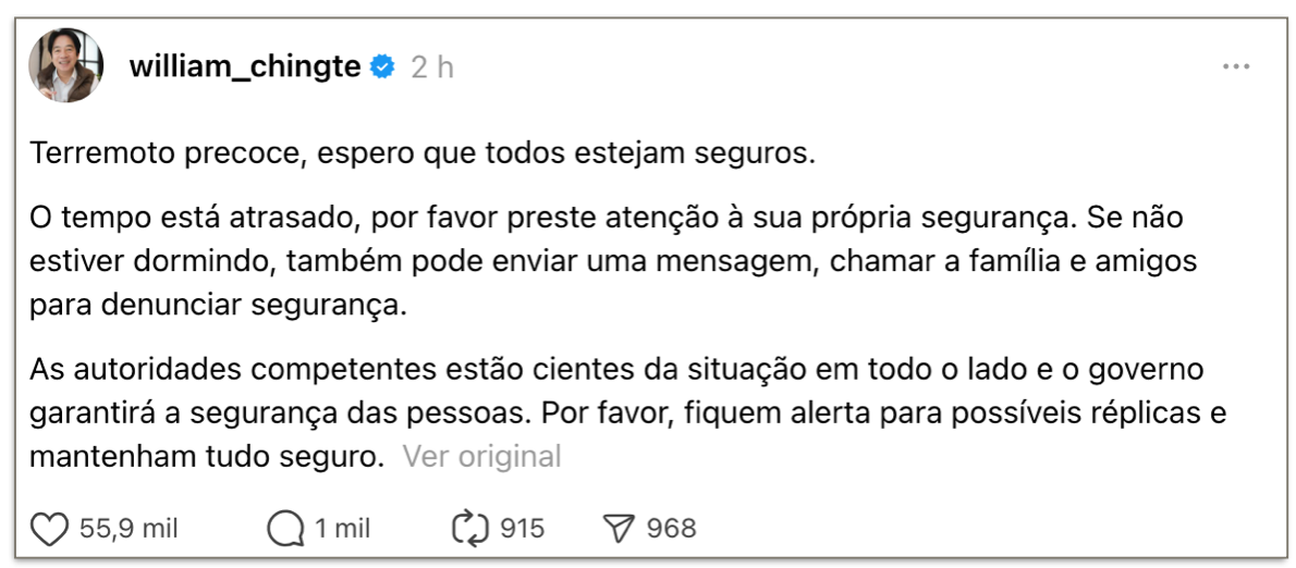 O líder de Taiwan, Lai Ching-te (Partido Democrático Progressista), afirmou nas redes sociais que espera que a população esteja em segurança e pediu atenção a possíveis réplicas.