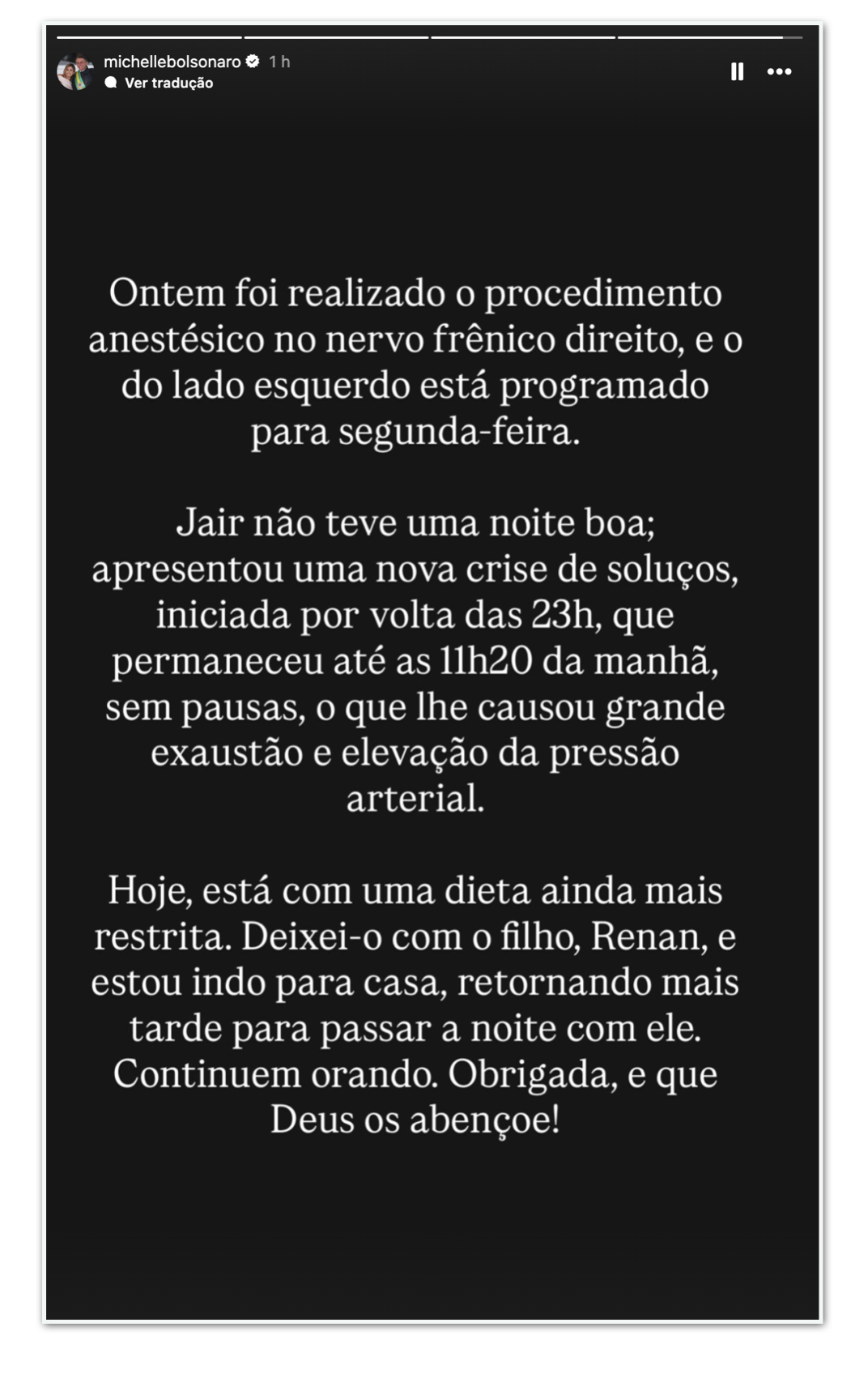 “Jair não teve uma noite boa; apresentou uma nova crise de soluços, iniciada por volta das 23h, que permaneceu até às 11h20 da manhã, sem pausas, o que lhe causou grande exaustão e elevação da pressão arterial”, escreveu Michelle em seu perfil no Instagram.