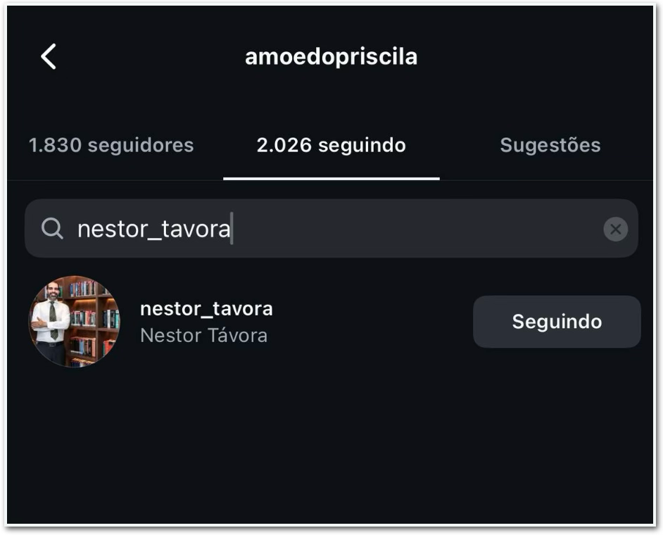 No Instagram, Priscila Amoedo segue o advogado Nestor Távora (ele não a segue de volta)