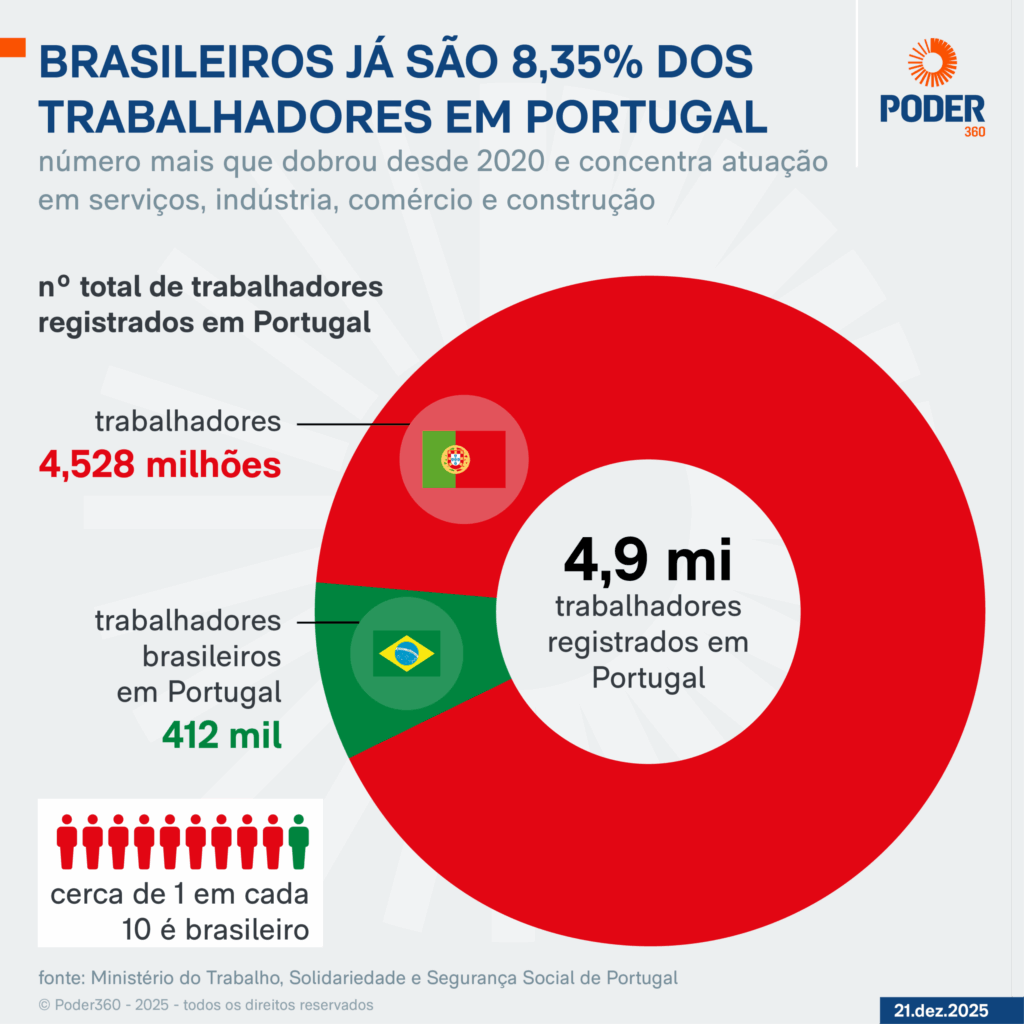 Em um país com cerca de 10,7 milhões de habitantes, há aproximadamente 5,3 milhões de pessoas empregadas em Portugal, segundo o INE (Instituto Nacional de Estatística). Os dados fornecidos ao Poder360 pelo Ministério do Trabalho, Solidariedade e Segurança Social indicam que os portugueses representam a maior parcela: 4,5 milhões. No mesmo recorte, 412 mil trabalhadores registrados são brasileiros –número que equivale a quase 10% do total de portugueses ocupados e a cerca de 7,8% do total.