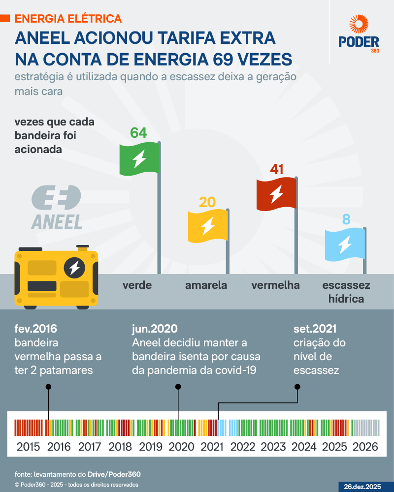A Aneel (Agência Nacional de Energia Elétrica) acionou tarifa extra na conta de energia elétrica 69 vezes desde que o mecanismo de bandeiras foi criado, em 2015, para sinalizar aos consumidores os custos reais da geração de energia elétrica no Brasil, segundo levantamento realizado pelo Poder360.