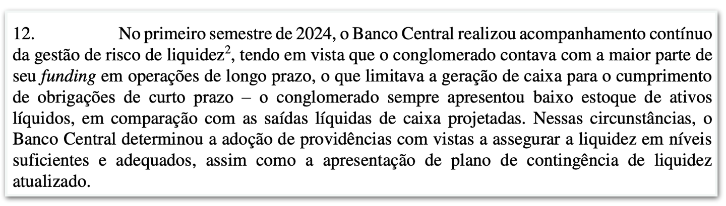 No 1º semestre de 2024, o Banco Central disse que o Master contava com a maior parte de seu funding em operações de longo prazo, o que limitava a expansão de caixa para o cumprimento das obrigações de curto prazo.