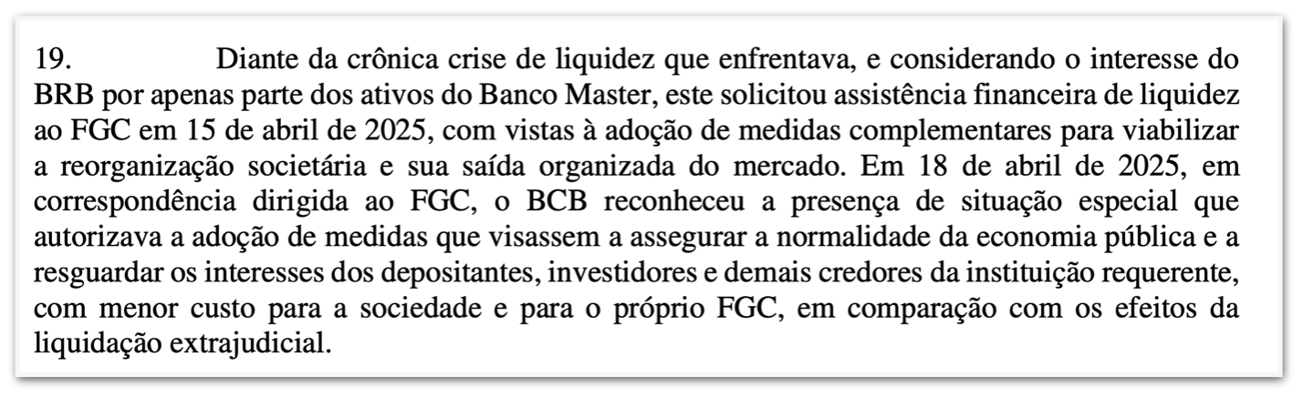 - insuficiência de capital porque o Master prestou “informações incorretas” ao BC;