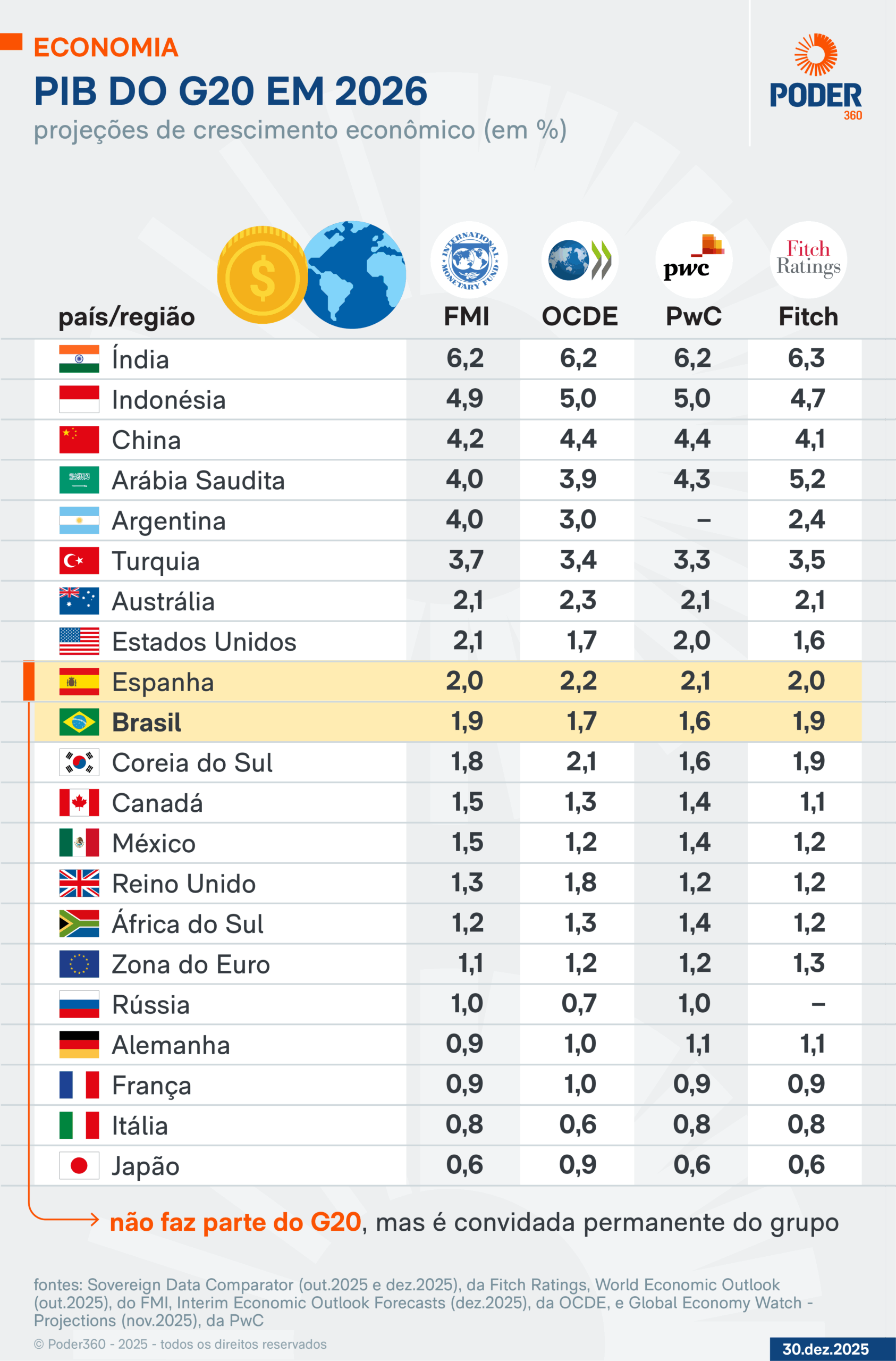A Espanha, que não faz parte do grupo, mas é convidada permanente, também deve ter uma expansão maior de sua atividade econômica. Os EUA crescerão em ritmo levemente superior ao Brasil, segundo o FMI e a PwC.