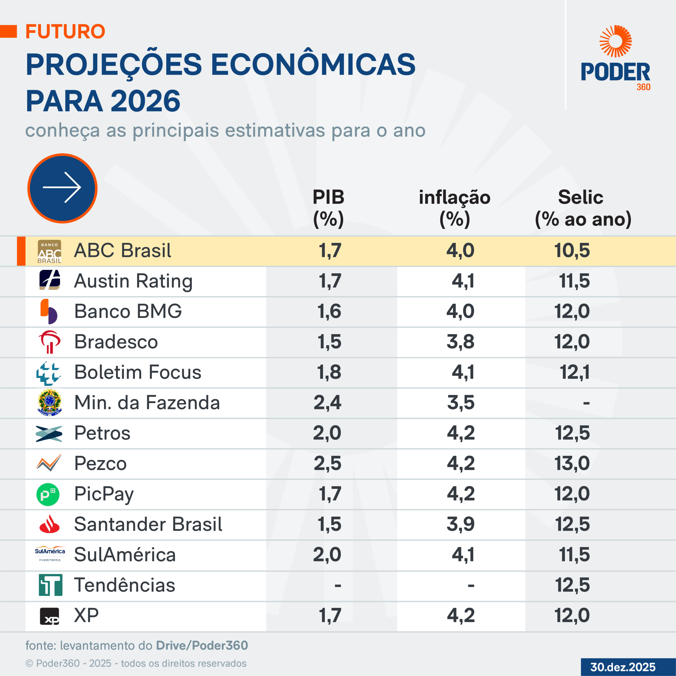 Os bancos Bradesco e Santander Brasil têm a projeção mais pessimista –alta de 1,5% do PIB em 2026. A consultoria Pezco tem a maior estimativa (avanço de 2,5%).