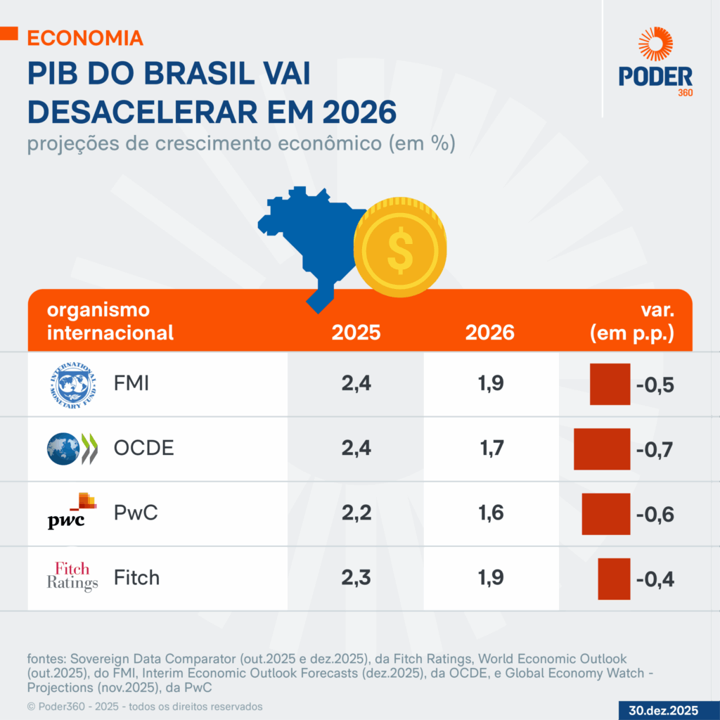 As projeções dessas organizações para a alta do PIB do Brasil vão de 1,6% a 1,9%. Também apostam que haverá uma desaceleração da atividade econômica brasileira em 2026 na comparação com 2025.