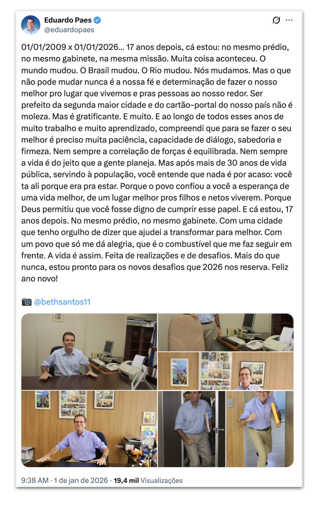 “01/01/2009 X 01/01/2026… 17 anos depois, cá estou: no mesmo prédio, no mesmo gabinete, na mesma missão. Muita coisa aconteceu. O mundo mudou. O Brasil mudou. O Rio mudou. Nós mudamos”, escreveu o prefeito.
