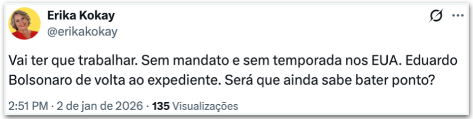 “Vai ter que trabalhar. Sem mandato e sem temporada nos EUA. Eduardo Bolsonaro de volta ao expediente. Será que ainda sabe bater ponto?”, afirmou a deputada Erika Kokay (PT-DF).