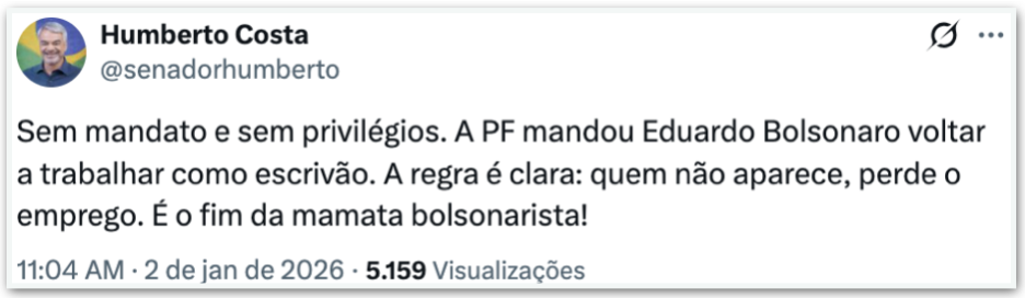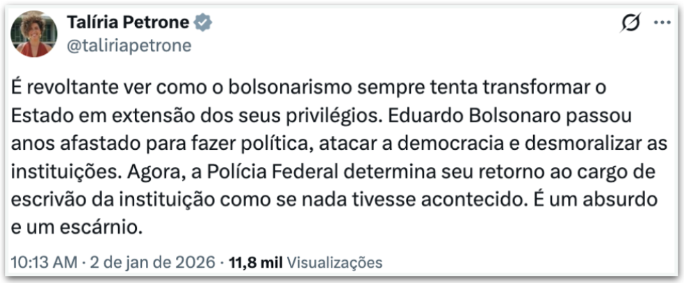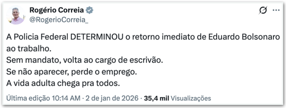Políticos governistas ironizaram nesta 6ª feira (2.jan.2025), nas redes sociais, a determinação da PF (Polícia Federal) para que o ex-deputado Eduardo Bolsonaro (PL-SP) retorne imediatamente ao cargo de escrivão depois da cassação do seu mandato de deputado.