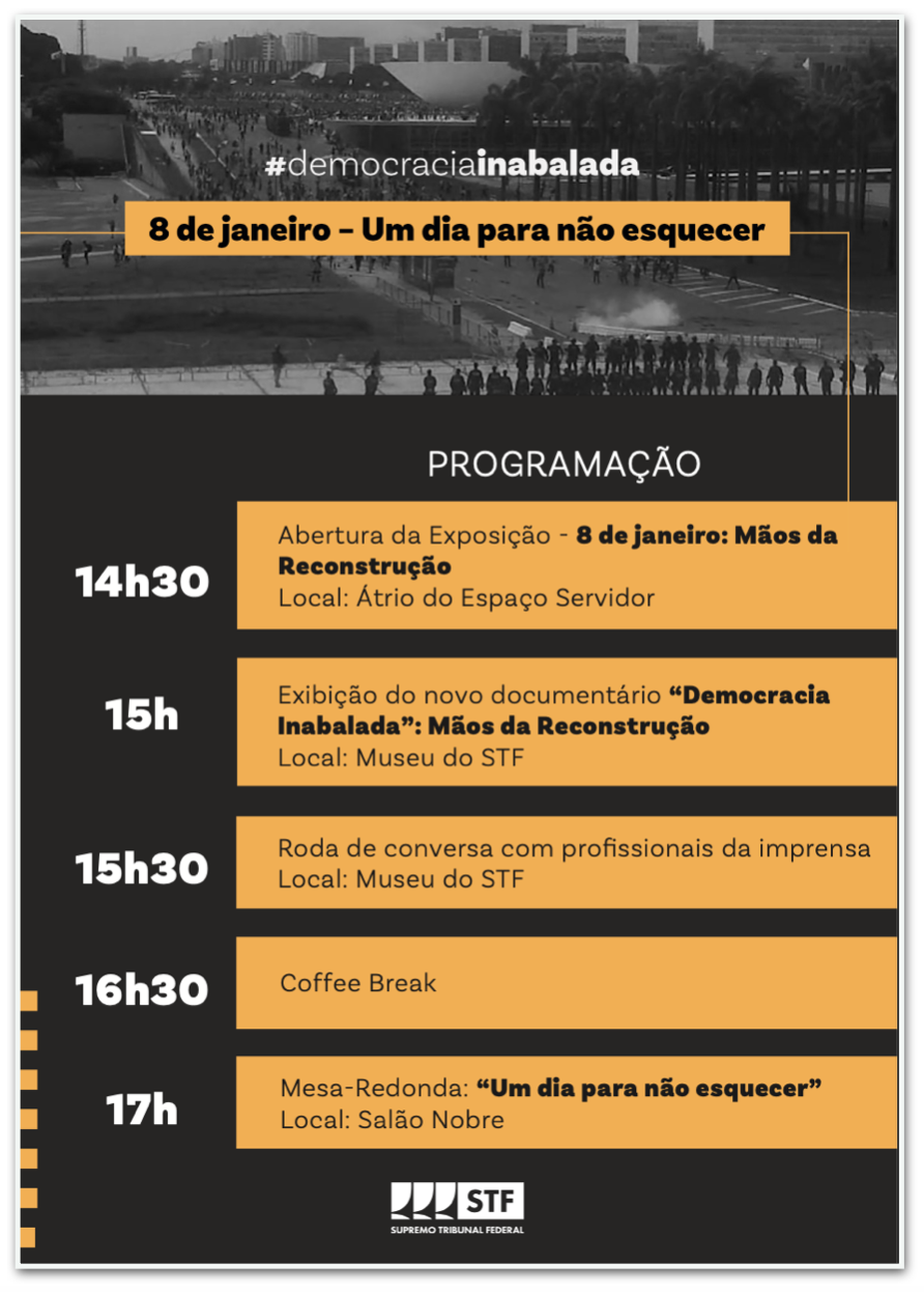 A iniciativa, chamada “Democracia Inabalada: 8 de janeiro – Um dia para não esquecer”, inclui exposição, documentário, debate com jornalistas e mesa-redonda.