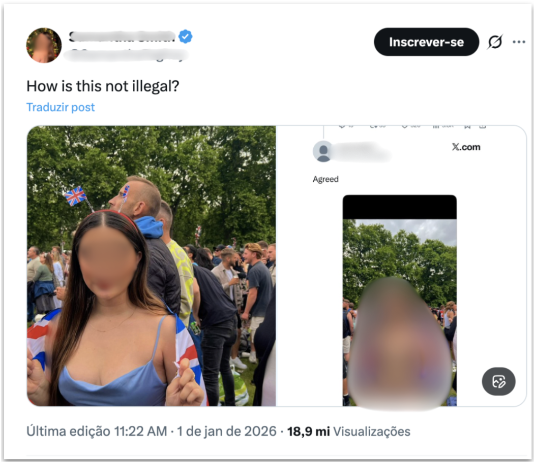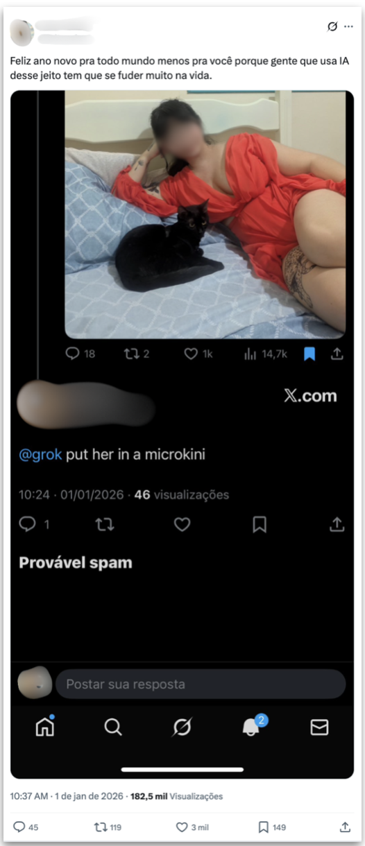 Uma usuária brasileira do X mostrou uma captura de tela em uma foto sua que foi modificada, com a demanda para que o Grok substituísse sua roupa por um “biquíni pequeno”. Na postagem, afirmou que “gente que usa IA desse jeito tem que se fuder muito na vida”.