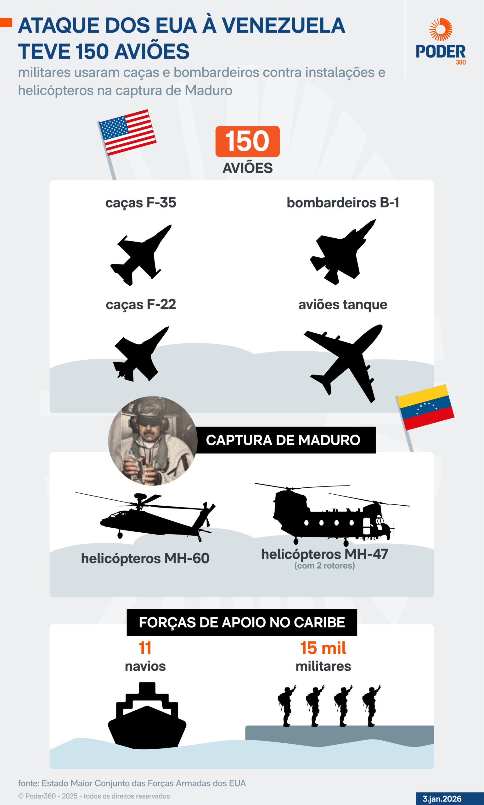As Forças Armadas dos Estados Unidos usaram 150 aeronaves nos ataques a 4 alvos na Venezuela na madrugada deste sábado (3.jan.2026). A informação foi divulgada por Dan Caine, chefe do Estado-Maior Conjunto das Forças Armadas dos EUA.