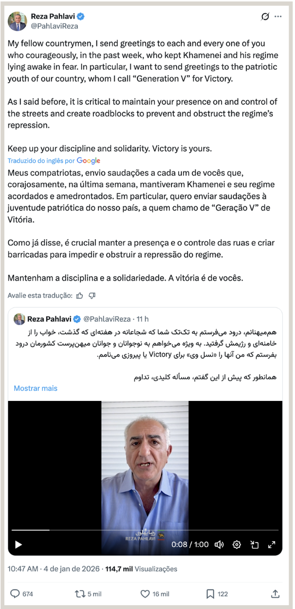 No X, o príncipe iraniano exilado, Reza Pahlavi, pediu aos manifestantes que mantenham presença nas ruas e criem bloqueios nas estradas para dificultar a repressão das forças de segurança. “Meus compatriotas, envio saudações a cada um de vocês que, corajosamente, na última semana, mantiveram Khamenei e seu regime acordados e amedrontados”, escreveu.