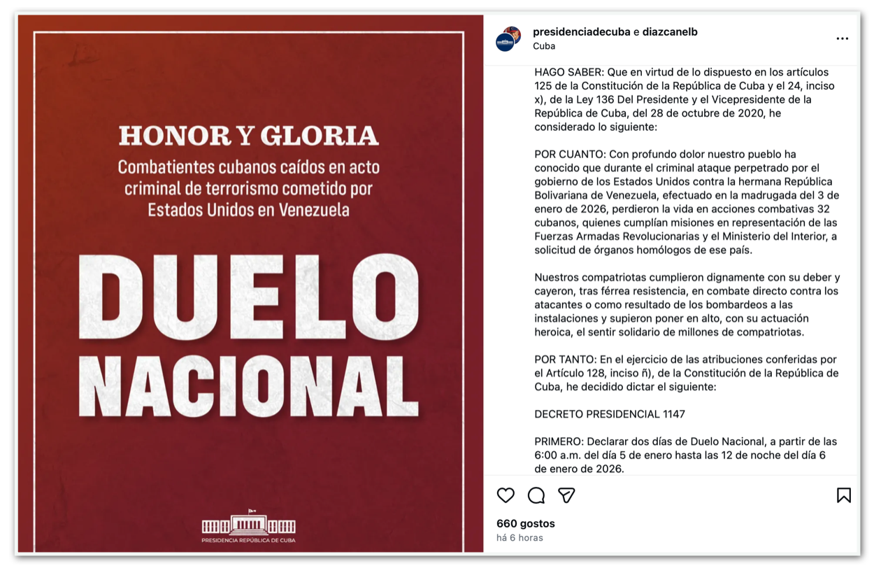 “Nosso povo tomou conhecimento, com profunda tristeza, de que, durante o ataque criminoso perpetrado pelo governo dos Estados Unidos contra a Venezuela, ocorrido na madrugada de 3 de janeiro de 2026, 32 cubanos perderam a vida em combate, enquanto cumpriam missões representando as Forças Armadas Revolucionárias e o Ministério do Interior, a pedido de seus homólogos naquele país”, diz a nota oficial do governo.