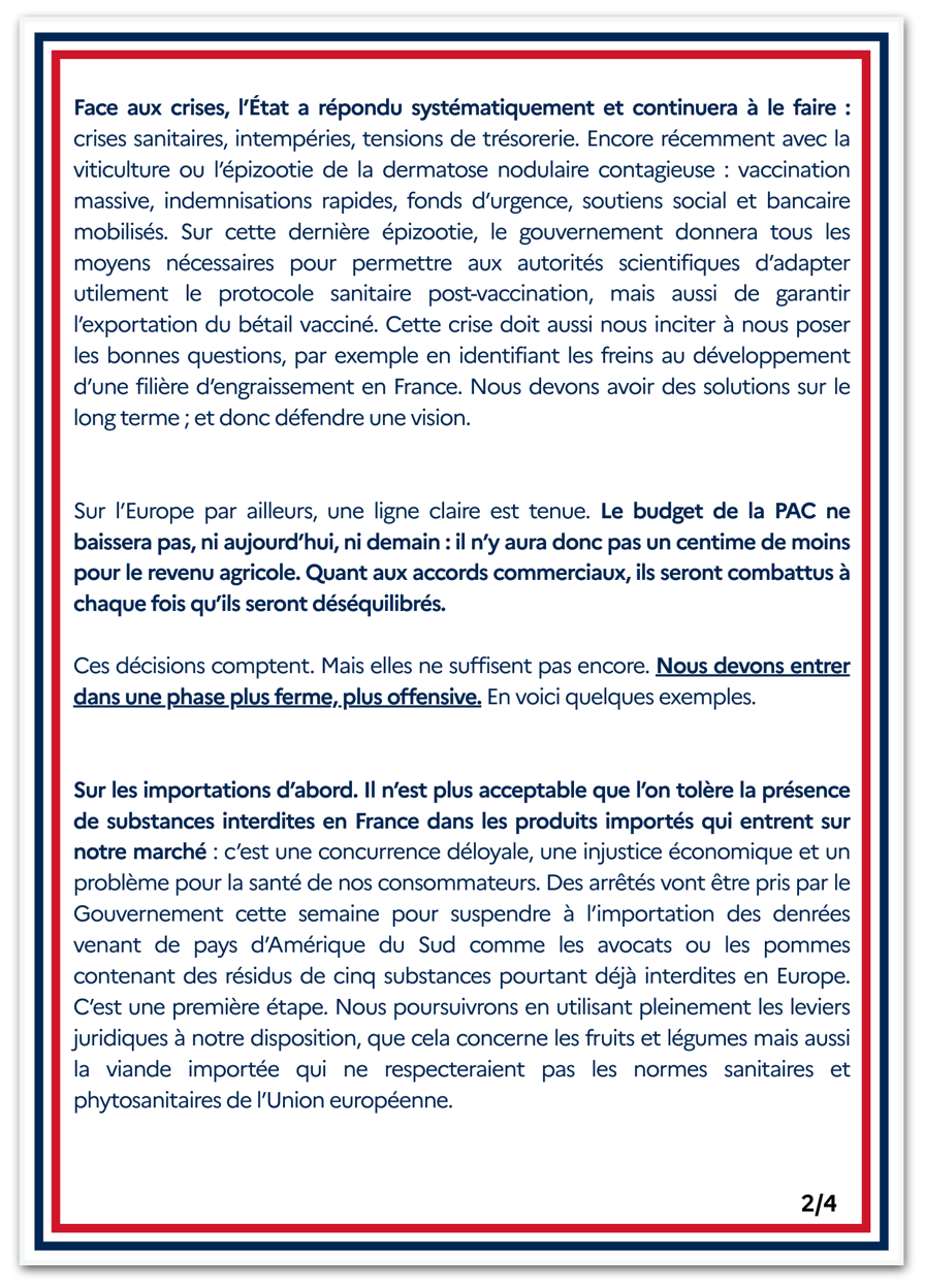 Depois do anúncio, Lecornu publicou em seu perfil no X uma “carta aberta aos agricultores” franceses. Ele afirmou que os controles sobre importações “serão fortemente reforçados” no país.