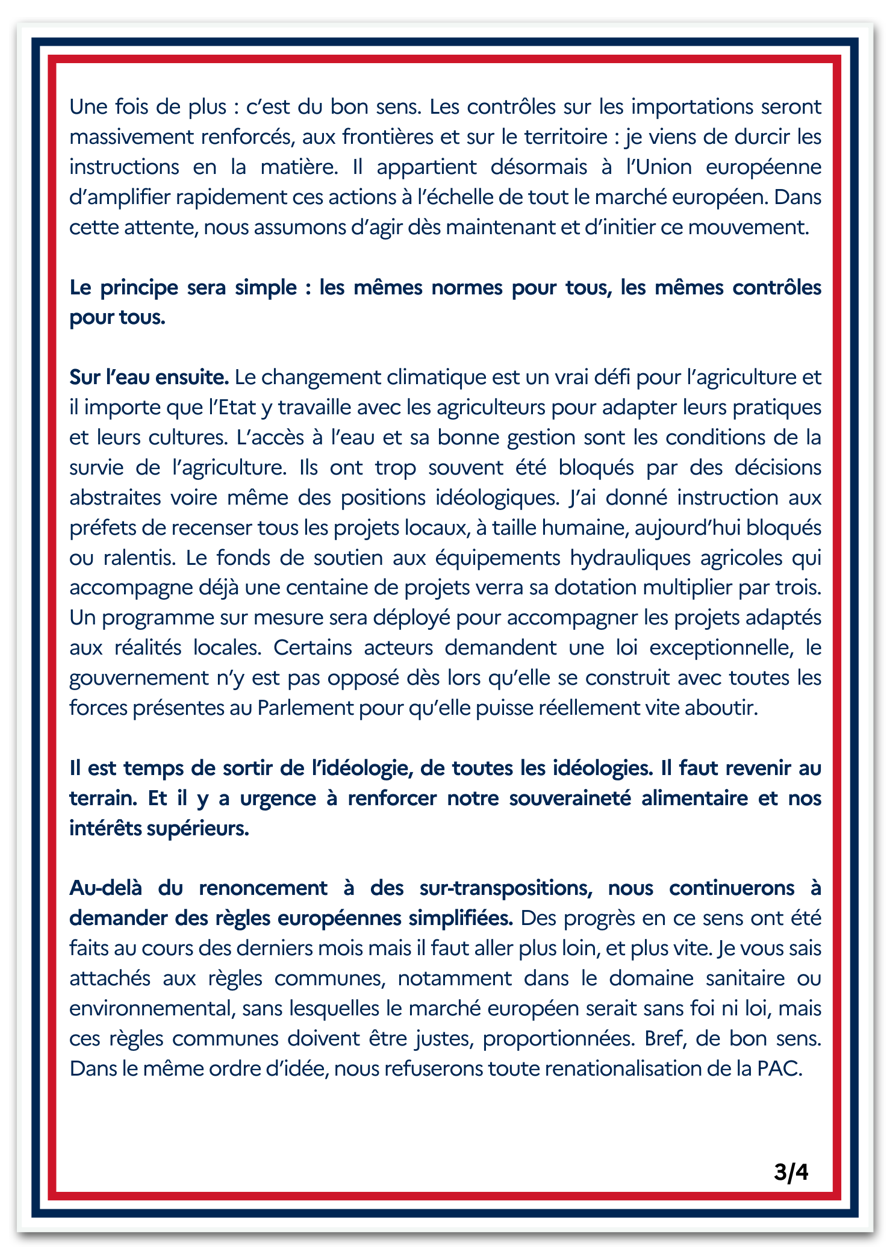 Depois do anúncio, Lecornu publicou em seu perfil no X uma “carta aberta aos agricultores” franceses. Ele afirmou que os controles sobre importações “serão fortemente reforçados” no país.