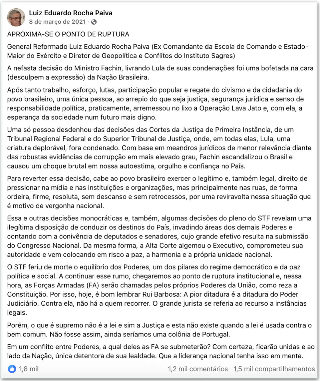 Em texto publicado nas naquele ano –e posteriormente divulgado no site do Clube Militar–, Rocha Paiva disse que a decisão do ministro poderia ocasionar uma “ruptura institucional”. Eis a íntegra: