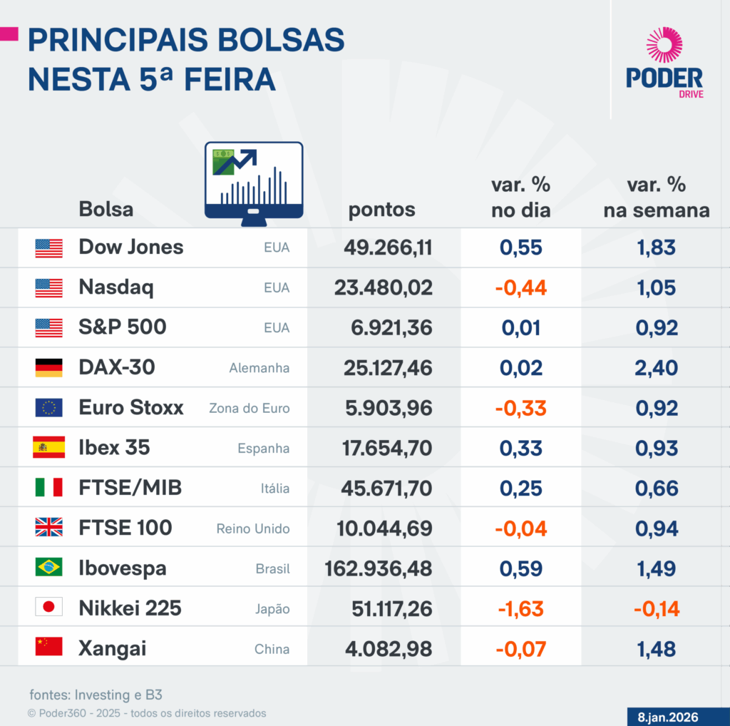 Os investidores também continuam monitorando as consequências do ataque dos EUA à Venezuela. O presidente dos Estados Unidos, Donald Trump (Partido Republicano), disse na 4ª feira (7.jan) que a supervisão norte-americana sobre o país caribenho e a extração de petróleo venezuelano poderão se estender por anos.