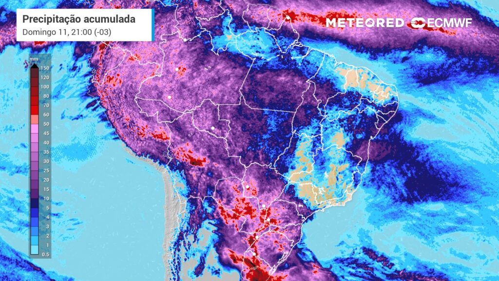 Os acumulados de chuva até este domingo (11) serão elevados, especialmente no oeste da Região Sul e do Mato Grosso do Sul, com pontos onde os volumes podem atingir ou superar os 100 mm. Nas áreas mais centrais e a leste dos estados, os acumulados variam entre 20 e 60 mm.