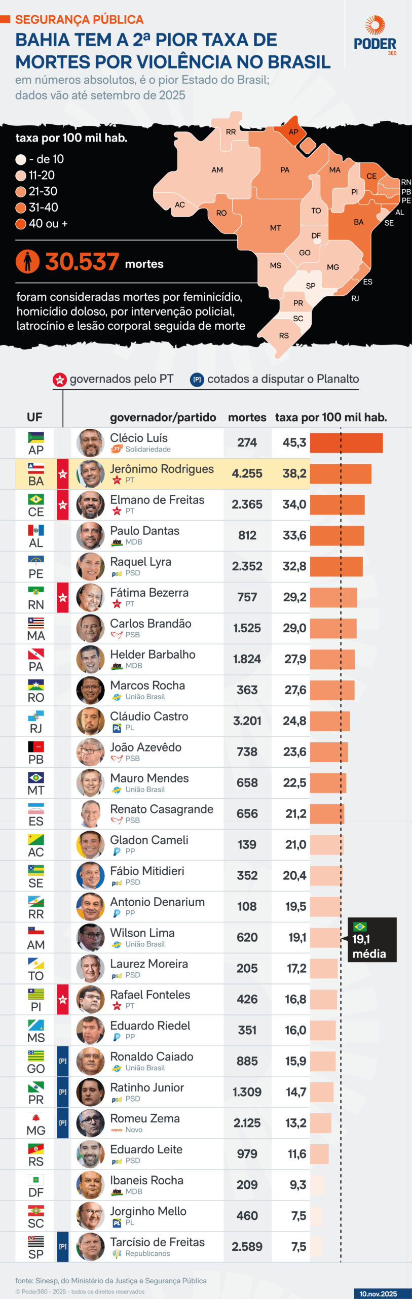 O governador da Bahia, Jerônimo Rodrigues (PT), atribuiu o avanço da violência no Estado à atuação do crime organizado em escala nacional e defendeu maior presença da União no controle de fronteiras, ao afirmar que armas e drogas entram no território baiano apesar de o Estado não produzir nem armamentos nem entorpecentes. Em entrevista à revista Veja, disse que a Bahia registra volumes elevados de apreensões e que o enfrentamento ao problema exige coordenação federal, além da responsabilidade dos governos estaduais.