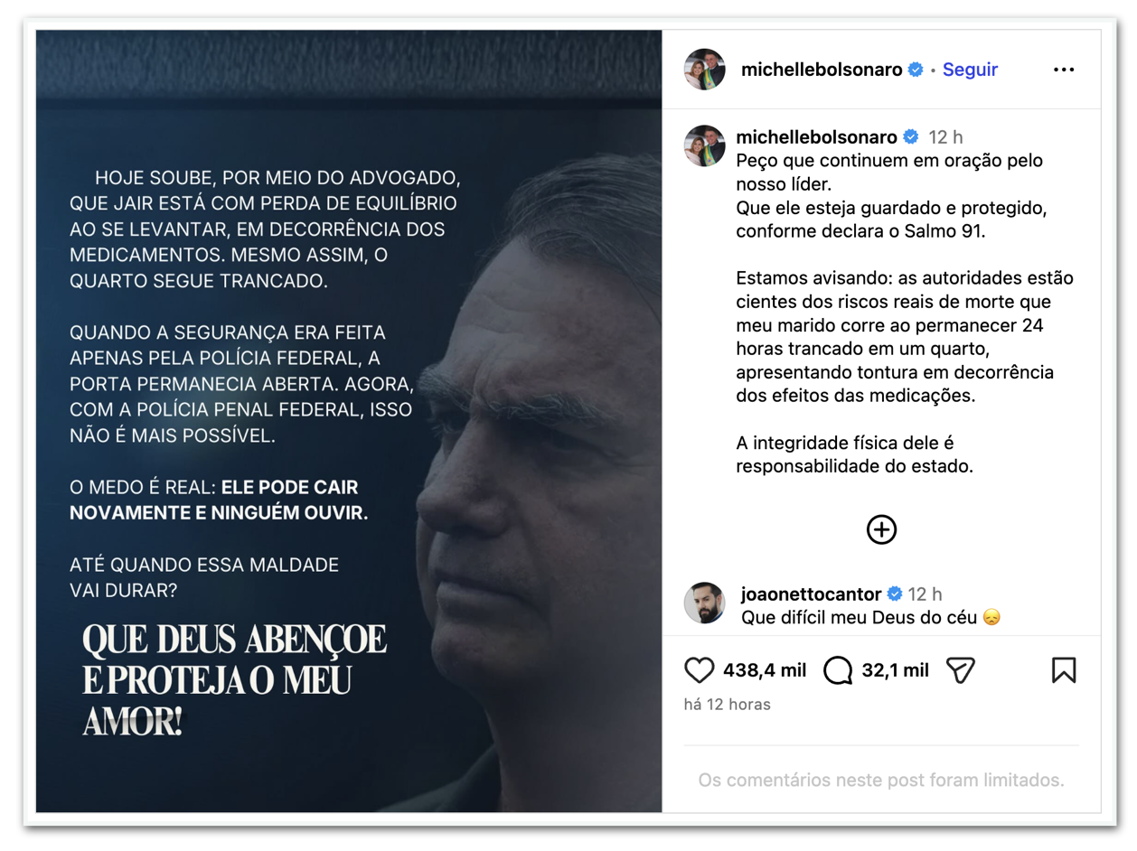 A ex-primeira-dama Michelle Bolsonaro disse na 6ª feira (9.jan.2026) que o marido, o ex-presidente Jair Bolsonaro (PL), “está com perda de equilíbrio ao se levantar, em decorrência dos medicamentos”. Ela publicou a mensagem em seu perfil no Instagram.