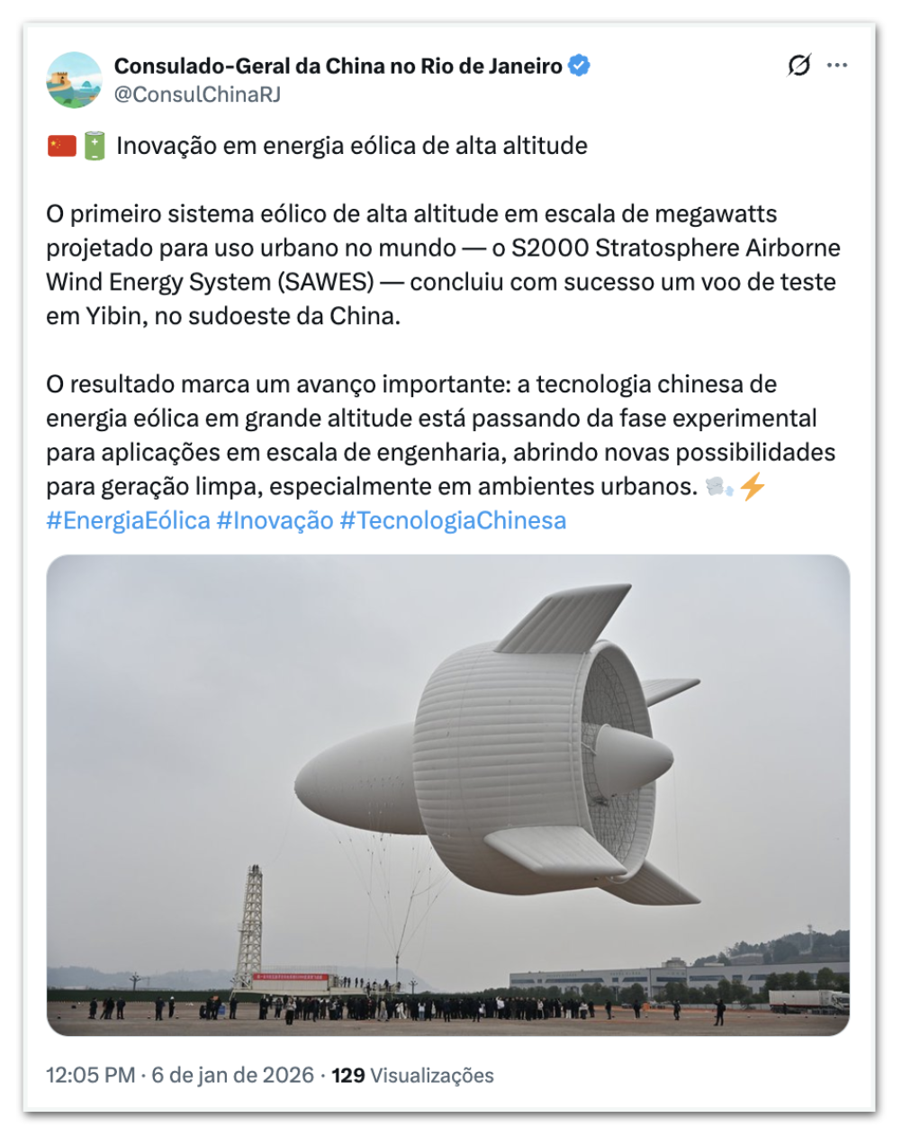 O Consulado Geral da China no Rio de Janeiro usou seu perfil no X em 6 de janeiro para falar do S200. Afirmou que a “tecnologia chinesa de energia eólica em grande altitude está passando da fase experimental para aplicações em escala de engenharia, abrindo novas possibilidades para geração limpa, especialmente em ambientes urbanos”.