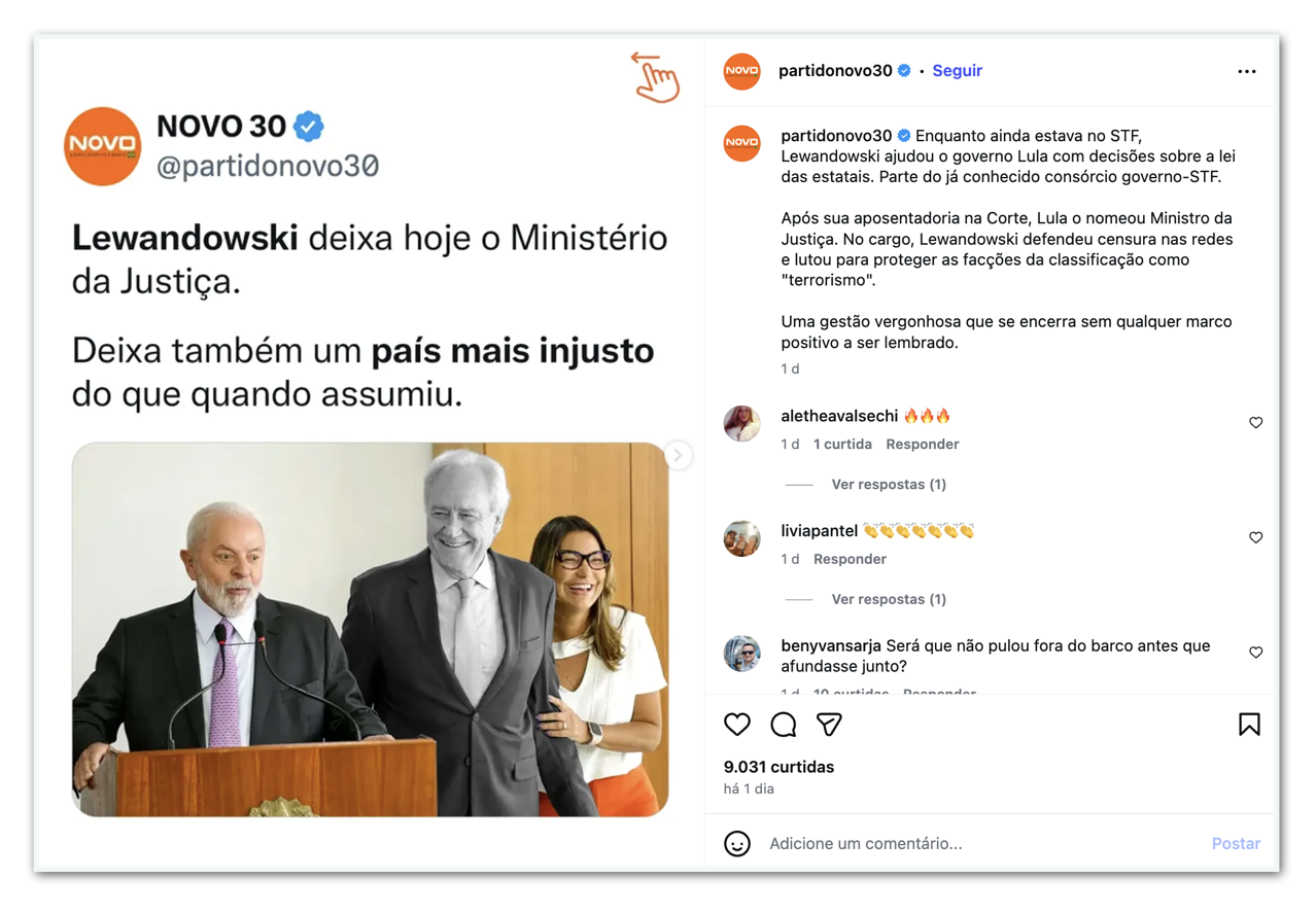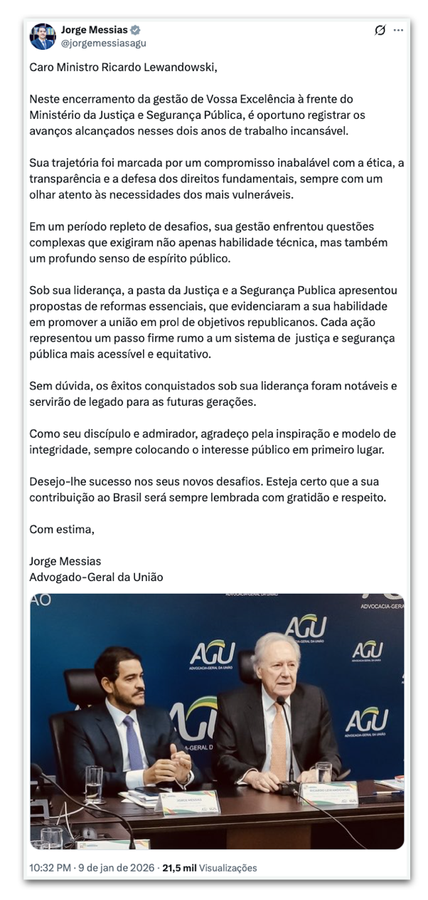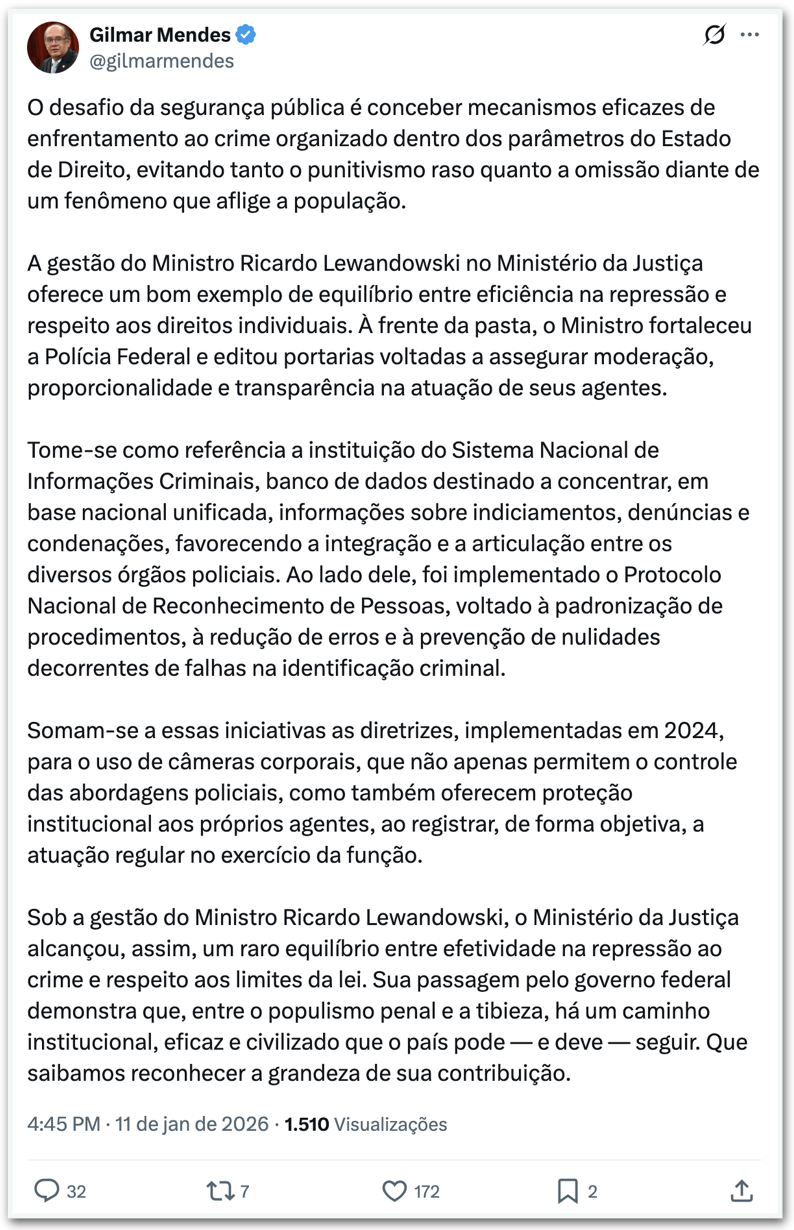 “A gestão do Ministro Ricardo Lewandowski no Ministério da Justiça oferece um bom exemplo de equilíbrio entre eficiência na repressão e respeito aos direitos individuais. À frente da pasta, o Ministro fortaleceu a Polícia Federal e editou portarias voltadas a assegurar moderação, proporcionalidade e transparência na atuação de seus agentes”, declarou no X.