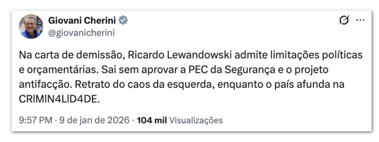 O deputado Giovani Cherini (PL-RS) também fez críticas a Lewandowski. Em seu perfil oficial no X, afirmou que o ex-ministro, em sua carta de demissão, reconheceu enfrentar limitações políticas e orçamentárias durante sua gestão. Classificou isso como “retrato do caos da esquerda, enquanto o país afunda na criminalidade”.
