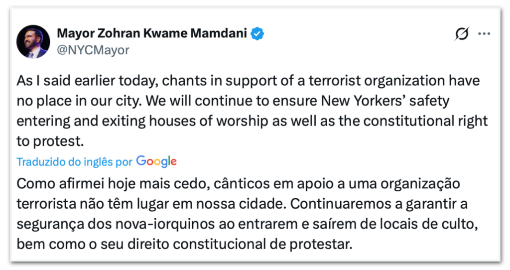 O prefeito da cidade de Nova York (EUA), Zohran Mamdani (Partido Democrata) condenou gritos de manifestantes a favor do Hamas. O político foi questionado, na 6ª feira (9.jan.2026), por jornalistas sobre um protesto em frente a uma sinagoga na noite de 5ª feira (8.jan), quando manifestantes pró-Palestina entoaram cânticos como “Say it loud, say it clear, we support Hamas here” (“Digam alto, digam claro, nós apoiamos o Hamas aqui”, em português).
