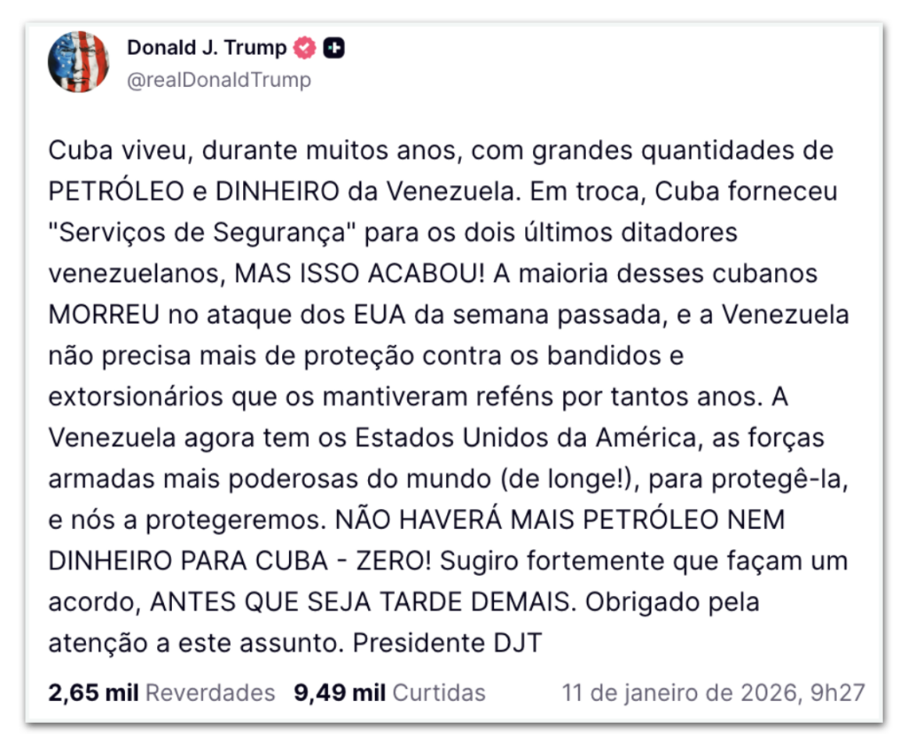 O presidente dos Estados Unidos, Donald Trump (Partido Republicano), disse neste domingo (11.jan.2026) que Cuba não receberá mais petróleo nem recursos financeiros provenientes da Venezuela.