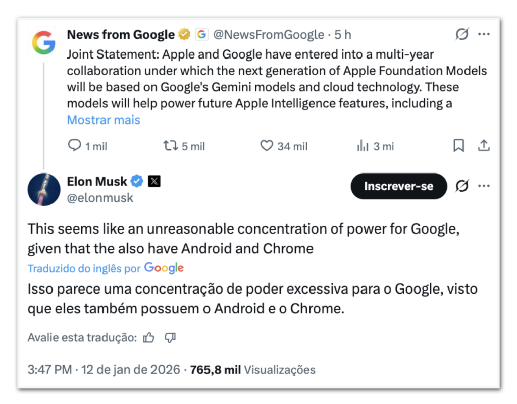 Elon Musk, proprietário da xAI e do chatbot Grok, reagiu à notícia na plataforma X. “Isso parece uma concentração de poder desproporcional para o Google, visto que eles também possuem o Android e o Chrome”, afirmou Musk em resposta ao anúncio.