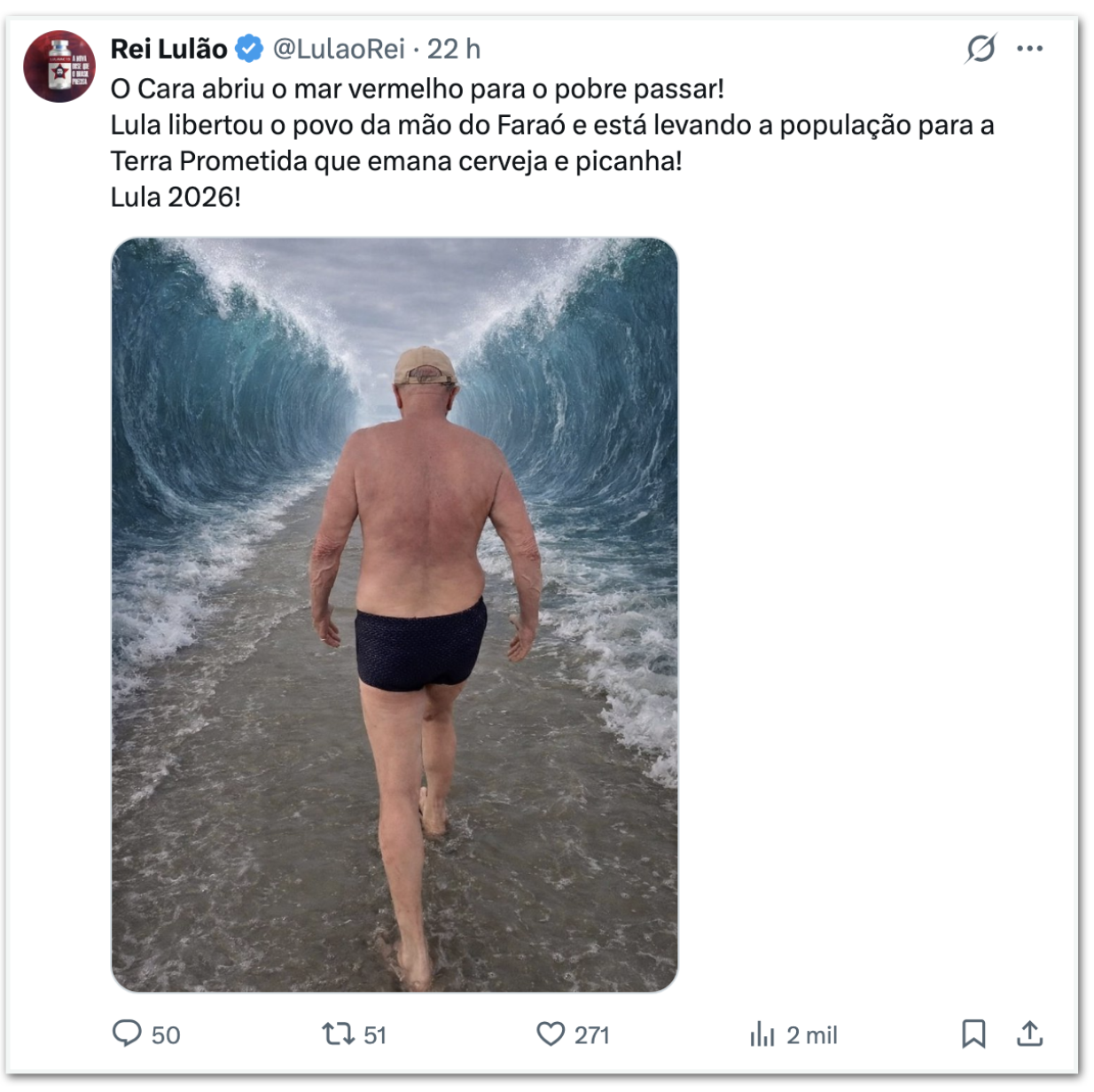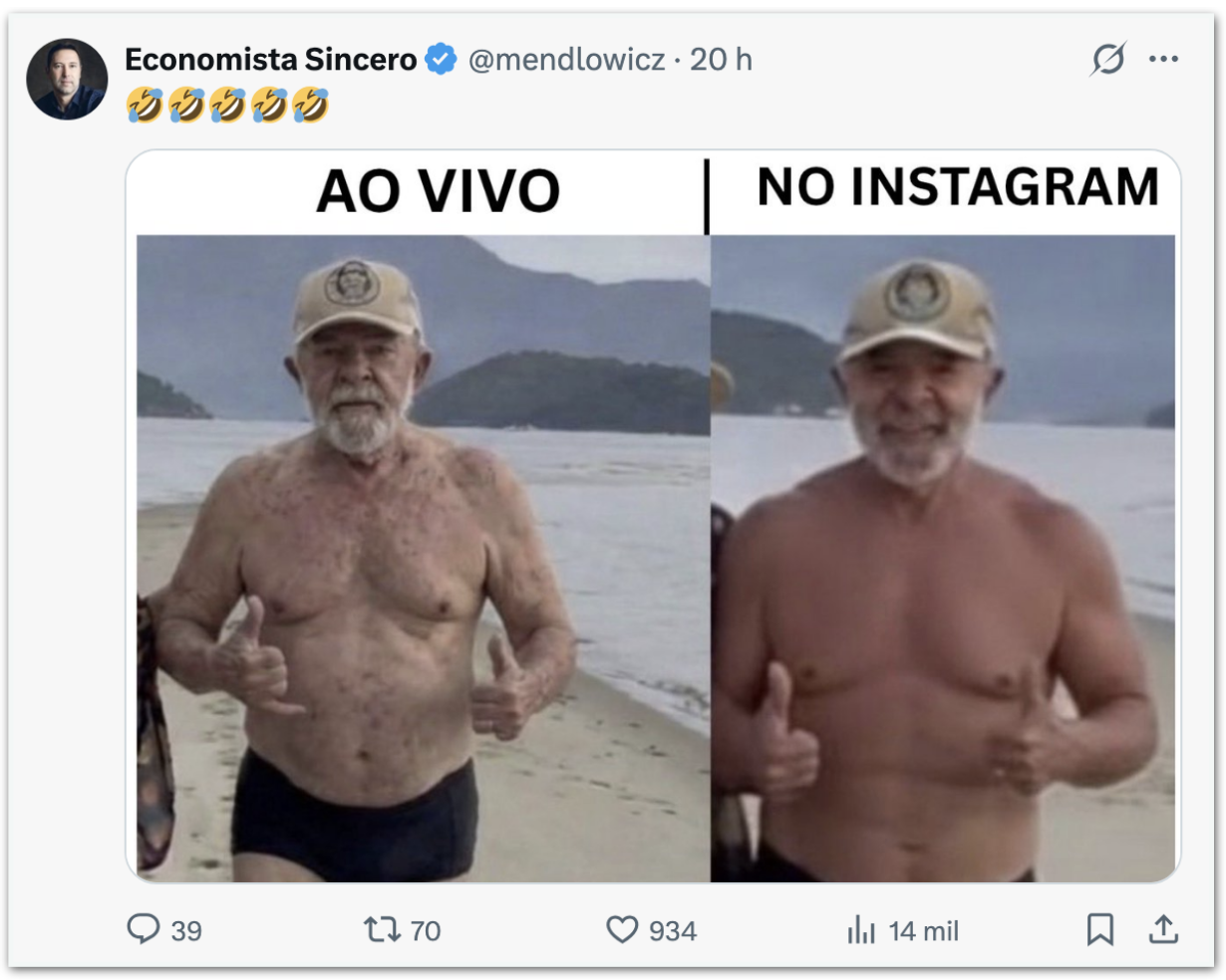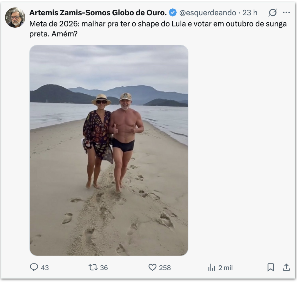 Internautas fizeram memes nas redes sociais nesta 2ª feira (12.jan.2026) com a foto editada do presidente Luiz Inácio Lula da Silva (PT) que foi compartilhada antes por políticos apoiadores do petista. Na imagem, o chefe do Executivo aparece andando de costas na praia e apresenta músculos definidos, diferentemente da imagem original.