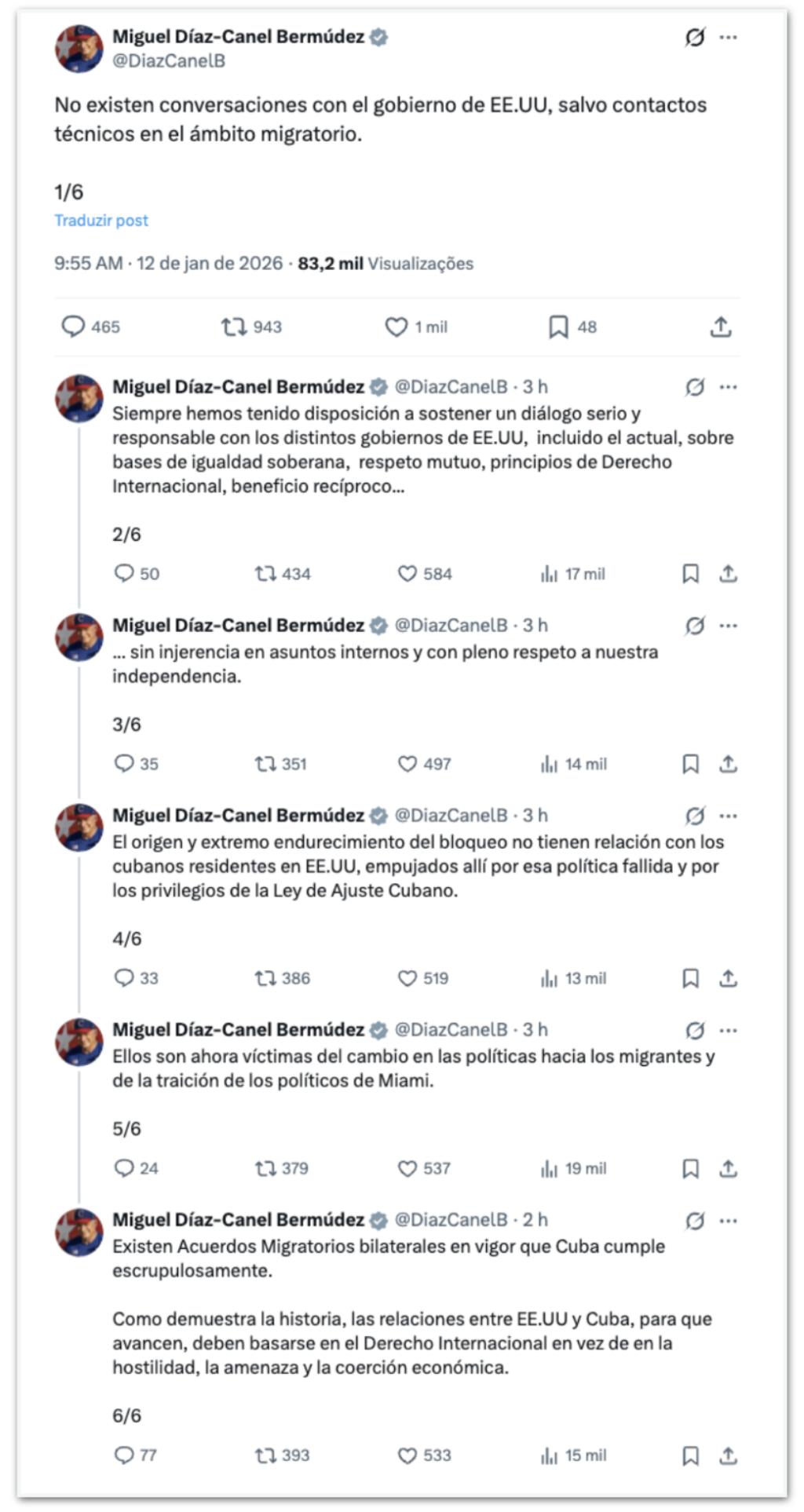 A declaração foi feita em uma sequência de publicações na rede social X. Segundo Díaz-Canel, Cuba mantém disposição para dialogar com os Estados Unidos, inclusive com o atual governo, mas apenas com base na “igualdade soberana, no respeito mútuo, nos princípios do Direito Internacional e no benefício recíproco”. O presidente cubano afirmou que qualquer negociação deve ser realizada sem ingerência em assuntos internos e com pleno respeito à independência do país.