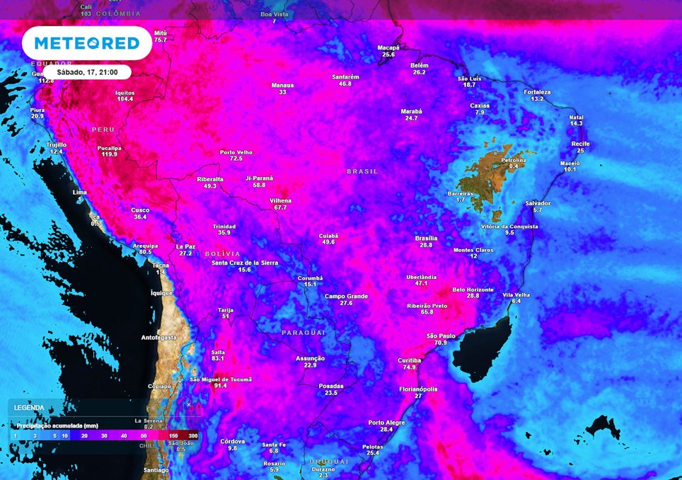 As chuvas também continuarão se formando no sábado (17) em toda a região Sul, embora os municípios gaúchos mais próximos do Uruguai já registrem tempo mais firme e chuvas mais fracas ao longo do dia. As chuvas também podem atingir outros estados, como é possível observar na imagem abaixo: